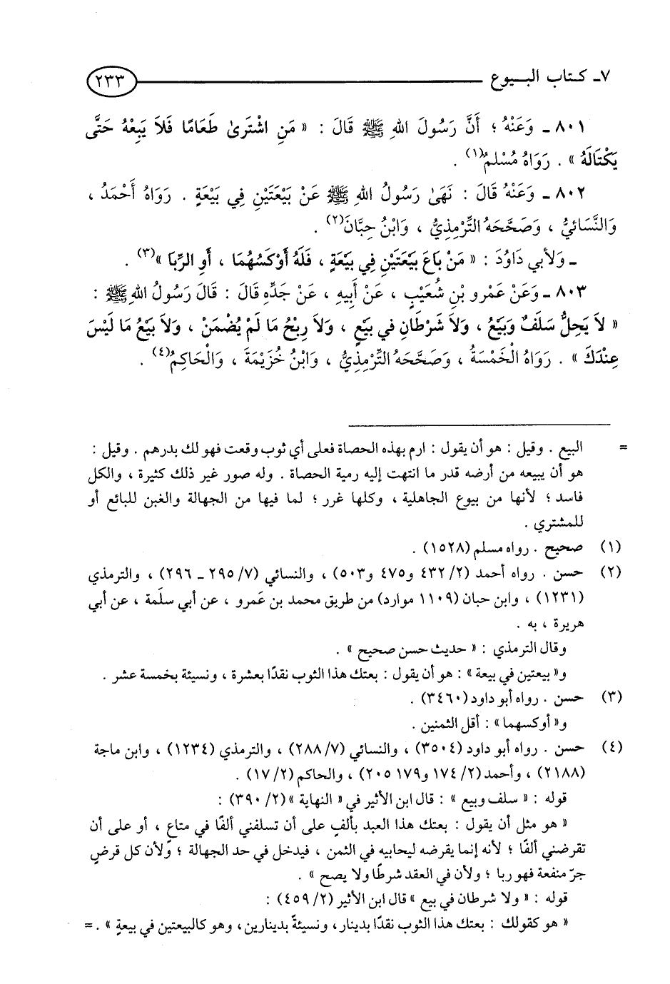 803 - وَعَنْ عَمْرِوِ بْنِ شُعَيْبٍ, عَنْ أَبِيهِ, عَنْ جَدِّهِ قَالَ: قَالَ رَسُولُ اللَّهِ - صلى الله عليه وسلم: «لَا يَحِلُّ سَلَفٌ وَبَيْعٌ وَلَا شَرْطَانِ فِي بَيْعٍ, وَلَا رِبْحُ مَا لَمْ يُضْمَنْ, وَلَا بَيْعُ مَا لَيْسَ عِنْدَكَ». رَوَاهُ الْخَمْسَةُ, وَصَحَّحَهُ التِّرْمِذِيُّ, وَابْنُ خُزَيْمَةَ, وَالْحَاكِمُ. (1)