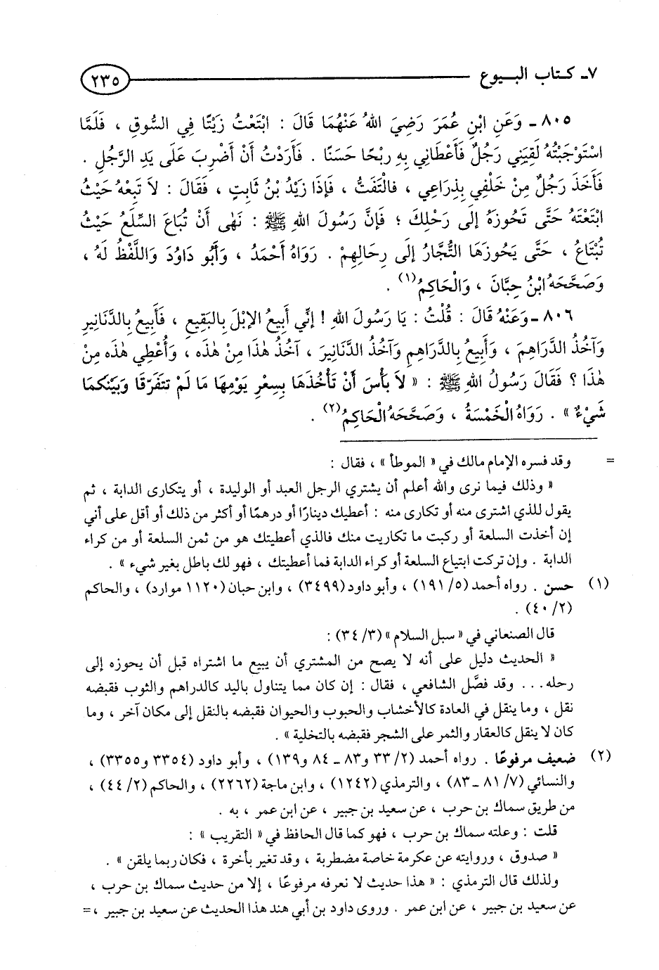 805 - وَعَنِ ابْنِ عُمَرَ رَضِيَ اللَّهُ عَنْهُمَا قَالَ: ابْتَعْتُ زَيْتًا فِي السُّوقِ, فَلَمَّا اسْتَوْجَبْتُهُ لَقِيَنِي رَجُلٌ فَأَعْطَانِي بِهِ رِبْحًا حَسَنًا، فَأَرَدْتُ أَنْ أَضْرِبَ عَلَى يَدِ الرَّجُلِ، فَأَخَذَ رَجُلٌ مِنْ خَلْفِي بِذِرَاعِي، فَالْتَفَتُّ, فَإِذَا هُوَ زَيْدُ بْنُ ثَابِتٍ, فَقَالَ: لَا تَبِعْهُ حَيْثُ ابْتَعْتَهُ حَتَّى تَحُوزَهُ إِلَى رَحْلِكَ; فَإِنَّ رَسُولَ اللَّهِ - صلى الله عليه وسلم - نَهَى أَنْ تُبَاعَ السِّلَعُ حَيْثُ تُبْتَاعُ, حَتَّى يَحُوزَهَا التُّجَّارُ إِلَى رِحَالِهِمْ. رَوَاهُ أَحْمَدُ, وَأَبُو دَاوُدَ وَاللَّفْظُ لَهُ, وَصَحَّحَهُ ابْنُ حِبَّانَ وَالْحَاكِمُ. (1)