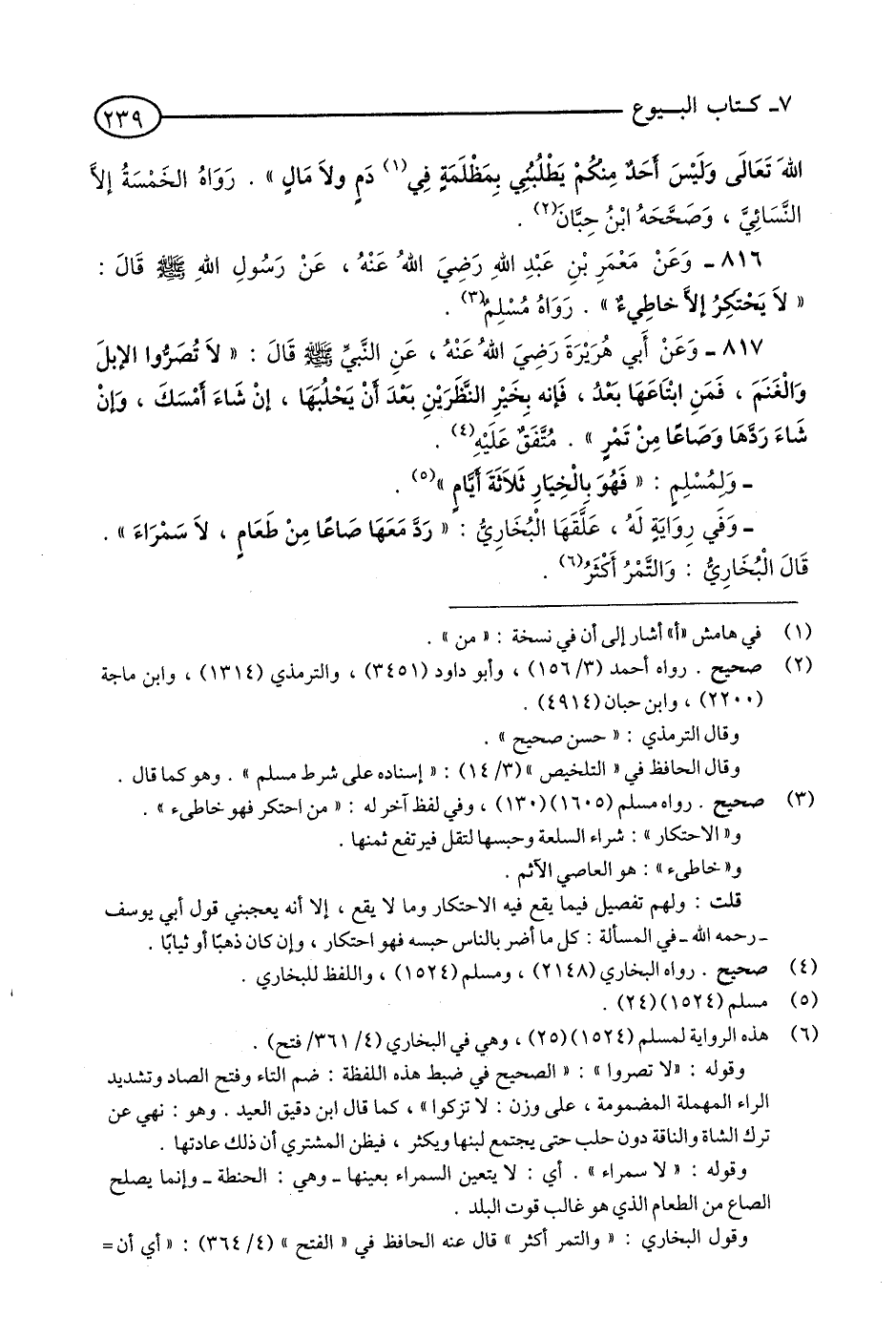 816 - وَعَنْ مَعْمَرِ بْنِ عَبْدِ اللَّهِ - رضي الله عنه - عَنْ رَسُولِ اللَّهِ - صلى الله عليه وسلم - قَالَ: «لَا يَحْتَكِرُ إِلَّا خَاطِئٌ». رَوَاهُ مُسْلِمٌ. (1)