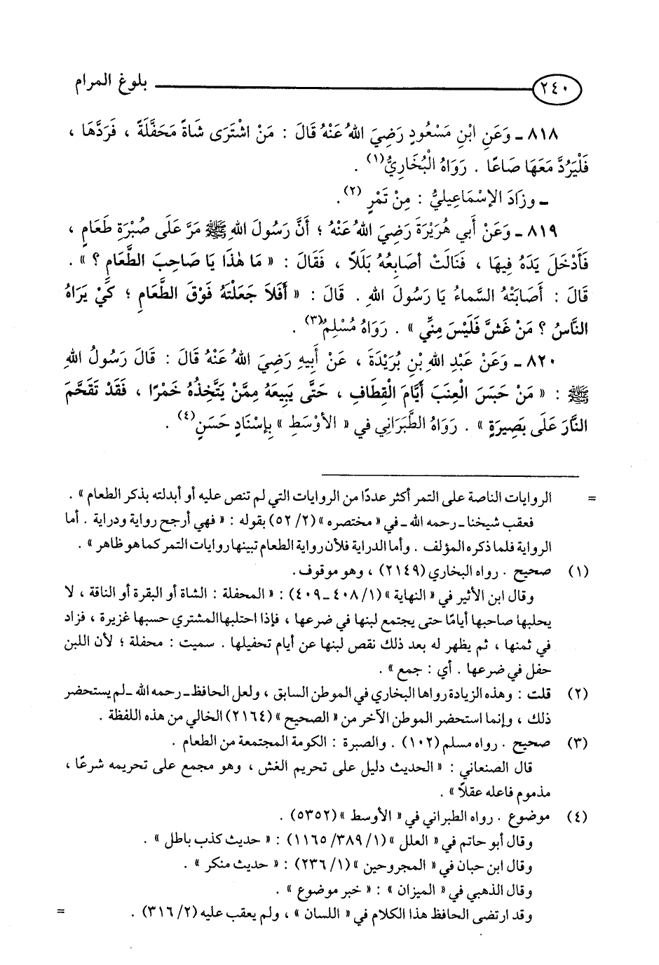 818 - وَعَنِ ابْنِ مَسْعُودٍ - رضي الله عنه - قَالَ: مَنِ اشْتَرَى شَاةً مَحَفَّلَةً, فَرَدَّهَا, فَلْيَرُدَّ مَعَهَا صَاعًا. رَوَاهُ الْبُخَارِيُّ. (1)