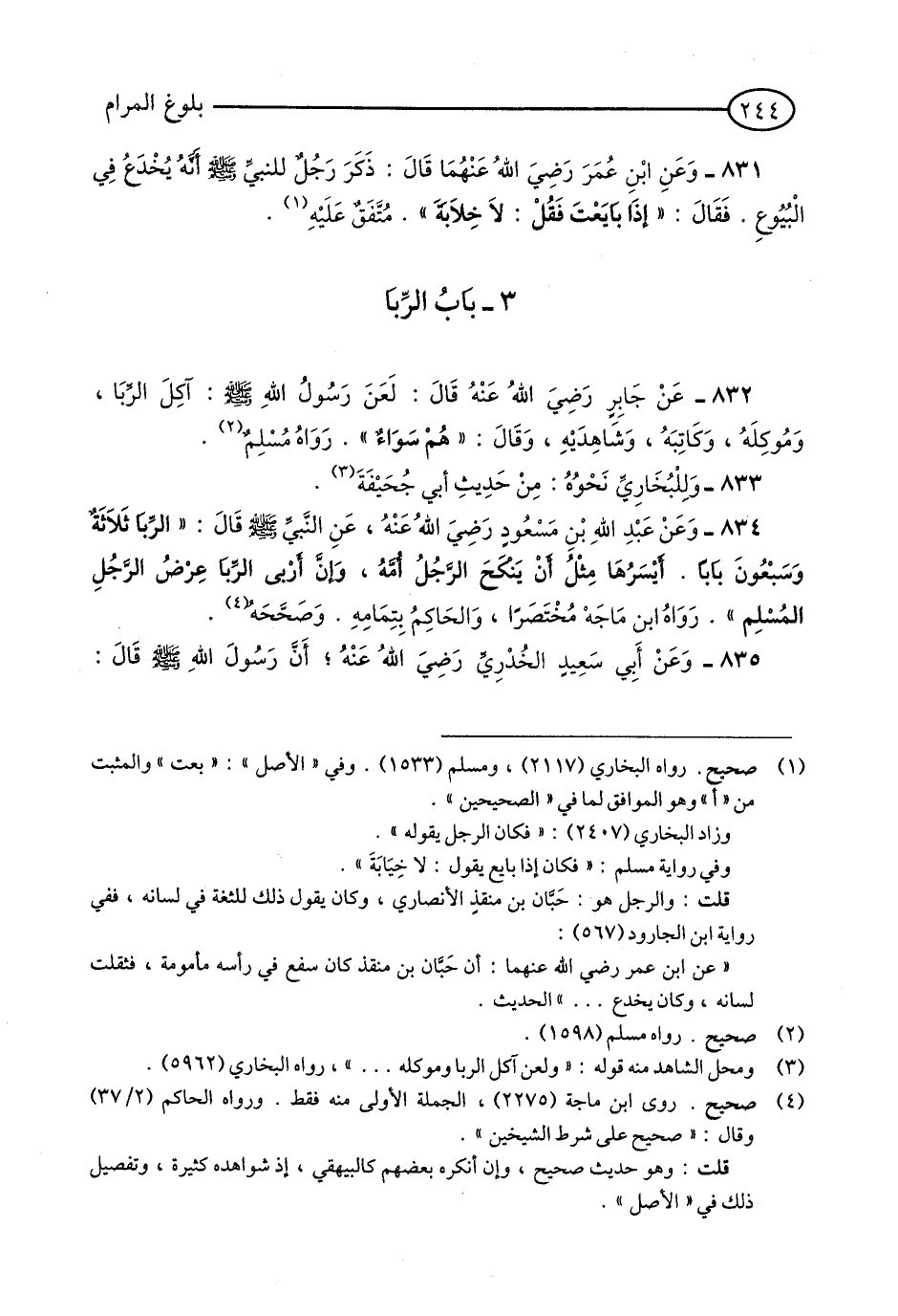 832 - عَنْ جَابِرٍ - رضي الله عنه - قَالَ: لَعَنَ رَسُولُ اللَّهِ - صلى الله عليه وسلم - آكِلَ الرِّبَا, وَمُوكِلَهُ, وَكَاتِبَهُ, وَشَاهِدَيْهِ, وَقَالَ: «هُمْ سَوَاءٌ». رَوَاهُ مُسْلِمٌ. (1)