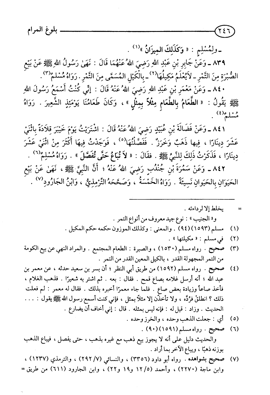 842 - وَعَنْ سَمُرَةَ بْنِ جُنْدُبٍ - رضي الله عنه، أَنَّ النَّبِيَّ - صلى الله عليه وسلم - نَهَى عَنْ بَيْعِ الْحَيَوَانِ بِالْحَيَوَانِ نَسِيئَةً. رَوَاهُ الْخَمْسَةُ, وَصَحَّحَهُ التِّرْمِذِيُّ, وَابْنُ الْجَارُودِ. (1)