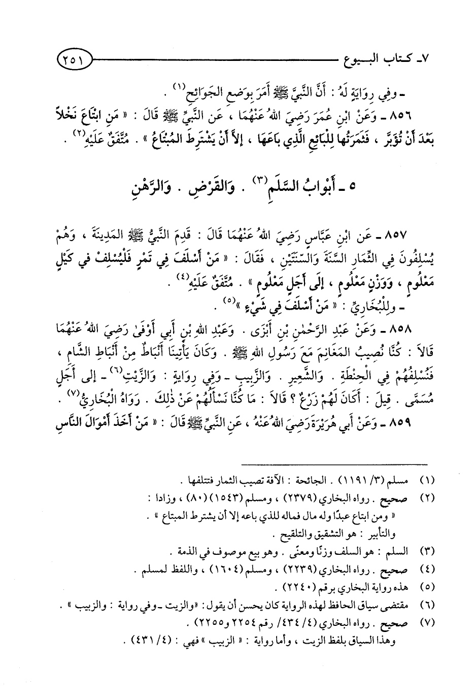 857 - عَنِ ابْنِ عَبَّاسٍ -رَضِيَ اللَّهُ عَنْهُمَا- قَالَ: قَدِمَ النَّبِيُّ - صلى الله عليه وسلم - الْمَدِينَةَ, وَهُمْ يُسْلِفُونَ فِي الثِّمَارِ السَّنَةَ وَالسَّنَتَيْنِ, فَقَالَ: مَنْ أَسْلَفَ فِي تَمْرٍ فَلْيُسْلِفْ فِي كَيْلٍ مَعْلُومٍ, وَوَزْنٍ مَعْلُومٍ, إِلَى أَجَلٍ مَعْلُومٍ. مُتَّفَقٌ عَلَيْهِ. (2)