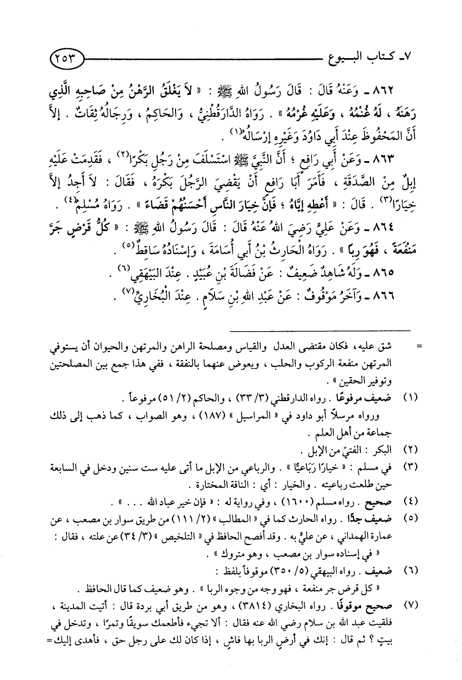 (3) - رواه البخاري (3814) وهو من طريق أبي بُردة قال: أتيت المدينة، فلقيت عبد الله بن سلام -رضي الله عنه-، فقال: ألا تجيء فأطعمك سويقًا وتمرًا، وتدخل في بيت؟ ثم قال: إنك في أرضٍ الرِّبا بها فاشٍ، إذا كان لك على رجل حق، فأهدى إليك حِمْل تِبْن، أو حِمْل شعير، أو حمل قَتٍّ، فإنه ربا. «تنبيه»: نفى صاحب «سبل السلام» وجود هذا الأثر في البخاري، وتبعه على ذلك كل من أخرج «البلوغ» إما تصريحًا وإما تلميحًا. مع أنه يوجد في موضعين من «الصحيح». وانظر «الأصل».