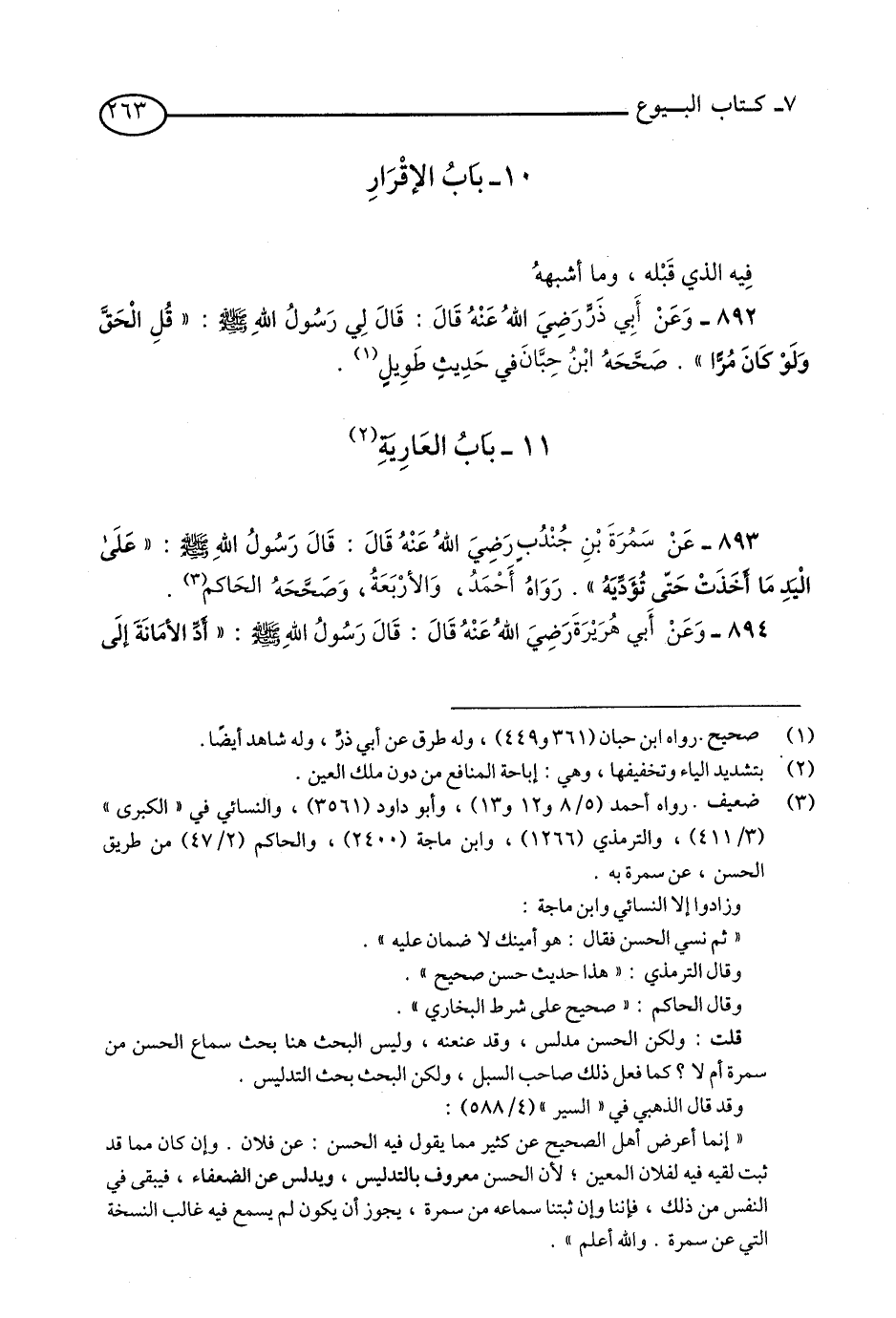 (1) - ضعيف. رواه أحمد (5/ 8 / و12 و13)، وأبو داود (3561)، والنسائي في «الكبرى» (3/ 411)، والترمذي (1266)، وابن ماجه (2400)، والحاكم (2/ 47) من طريق الحسن، عن سمرة، به. وزادوا إلا النسائي وابن ماجه. «ثم نسي الحسن فقال: هو أمينك لا ضمان عليه». وقال الترمذي: «هذا حديث حسن صحيح». وقال الحاكم: «صحيح على شرط البخاري». قلت: ولكن الحسن مدلس، وقد عنعنه، وليس البحث هنا بحث سماع الحسن من سمرة أم لا كما فعل ذلك صاحب السبل، ولكن البحث بحث التدليس. وقد قال الذهبي في «السير» (4/ 588) «قال قائل: إنما أعرض أهل الصحيح عن كثير مما يقول فيه الحسن: عن فلان. وإن كان مما قد ثبت لُقِيّه فيه لفلان المعيّن؛ لأن الحسن معروف بالتدليس، ويدلس عن الضعفاء، فيبقى في النفس من ذلك، فإننا وإن ثبتنا سماعه من سمرة، يجوز أن يكون لم يسمع فيه غالب النسخة التي عن سمرة. والله أعلم».