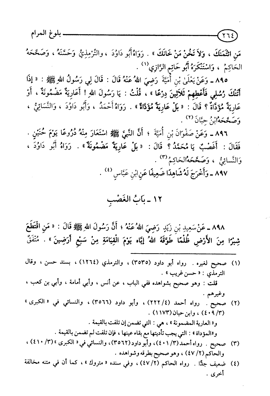 896 - وَعَنْ صَفْوَانَ بْنِ أُمَيَّةَ; - أَنَّ النَّبِيَّ - صلى الله عليه وسلم - اسْتَعَارَ مِنْهُ دُرُوعًا يَوْمَ حُنَيْنٍ. فَقَالَ: أَغَصْبٌ يَا مُحَمَّدُ? قَالَ: «بَلْ عَارِيَةٌ مَضْمُونَةٌ». رَوَاهُ أَبُو دَاوُدَ, وَالنَّسَائِيُّ, وَصَحَّحَهُ الْحَاكِمُ. (1)