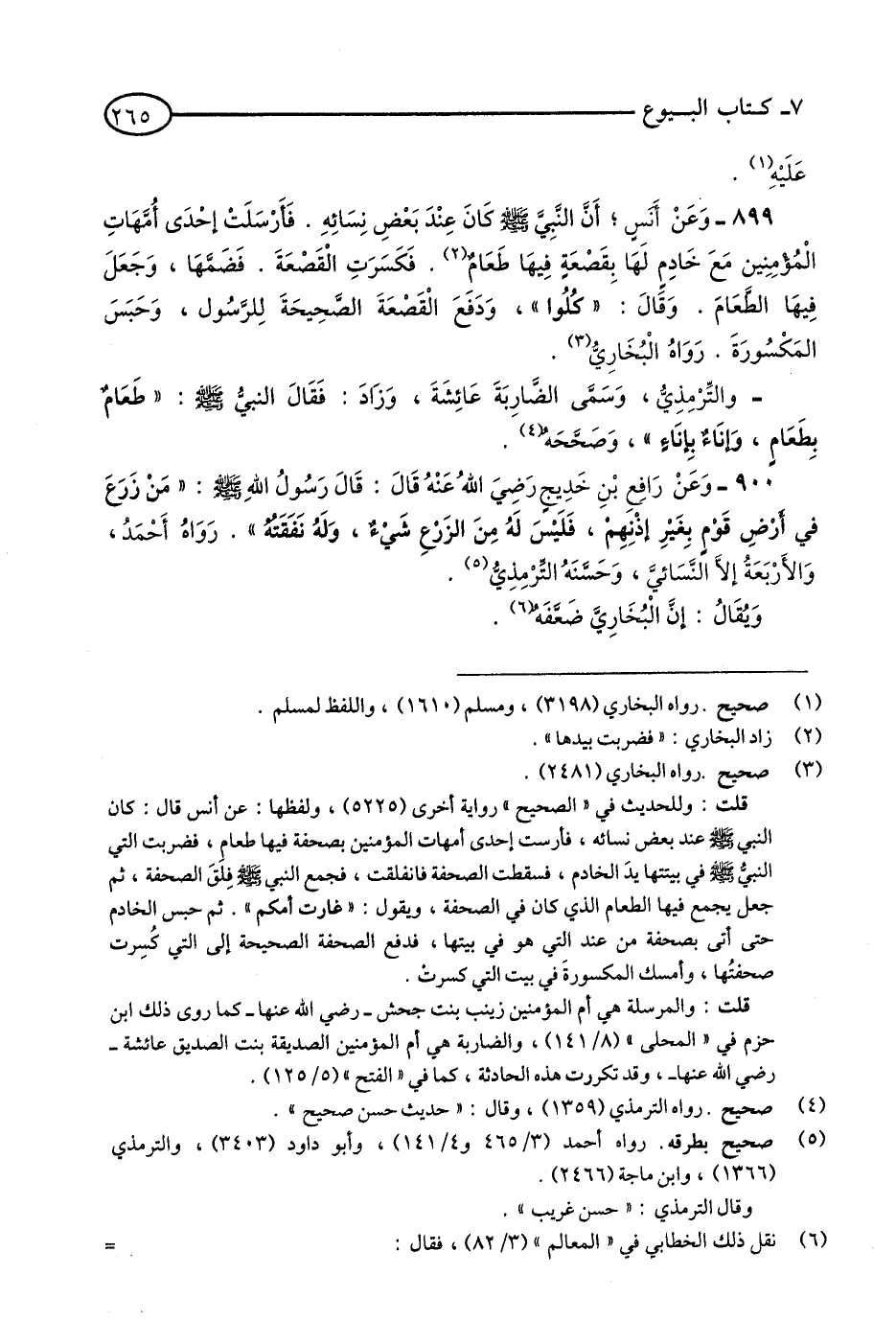 899 - وَعَنْ أَنَسٍ; - أَنَّ النَّبِيَّ - صلى الله عليه وسلم - كَانَ عِنْدَ بَعْضِ نِسَائِهِ، فَأَرْسَلَتْ إِحْدَى أُمَّهَاتِ الْمُؤْمِنِينَ (1) مَعَ خَادِمٍ لَهَا بِقَصْعَةٍ فِيهَا طَعَامٌ، فَكَسَرَتِ الْقَصْعَة، فَضَمَّهَا, وَجَعَلَ فِيهَا الطَّعَامَ. وَقَالَ: «كُلُوا» وَدَفَعَ الْقَصْعَةَ الصَّحِيحَةَ لِلرَّسُولِ, وَحَبَسَ الْمَكْسُورَةَ. رَوَاهُ الْبُخَارِيُّ. (2)