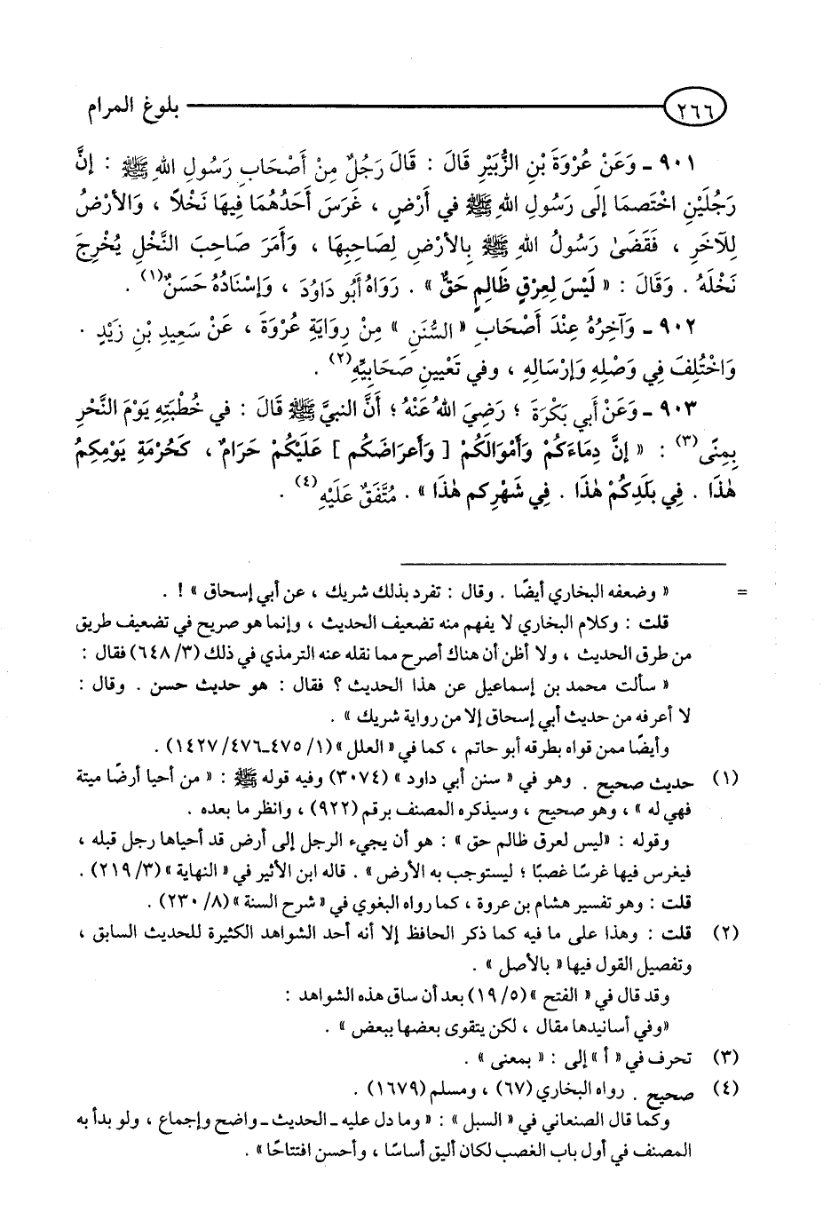 901 - وَعَنْ عُرْوَةَ بْنِ الزُّبَيْرِ قَالَ: قَالَ رَجُلٌ مِنَ الصَّحَابَةِ; مِنْ أَصْحَابِ رَسُولِ اللَّهِ - صلى الله عليه وسلم: إِنَّ رَجُلَيْنِ اخْتَصَمَا إِلَى رَسُولِ اللَّهِ - صلى الله عليه وسلم - فِي أَرْضٍ, غَرَسَ أَحَدُهُمَا فِيهَا نَخْلًا, وَالْأَرْضُ لِلْآخَرِ, فَقَضَى رَسُولُ اللَّهِ - صلى الله عليه وسلم - بِالْأَرْضِ لِصَاحِبِهَا, وَأَمَرَ صَاحِبَ النَّخْلِ أَنْ يُخْرِجَ نَخْلَهُ. وَقَالَ: «لَيْسَ لِعِرْقٍ ظَالِمٍ حَقٌّ». رَوَاهُ أَبُو دَاوُدَ, وَإِسْنَادُهُ حَسَنٌ. (1)