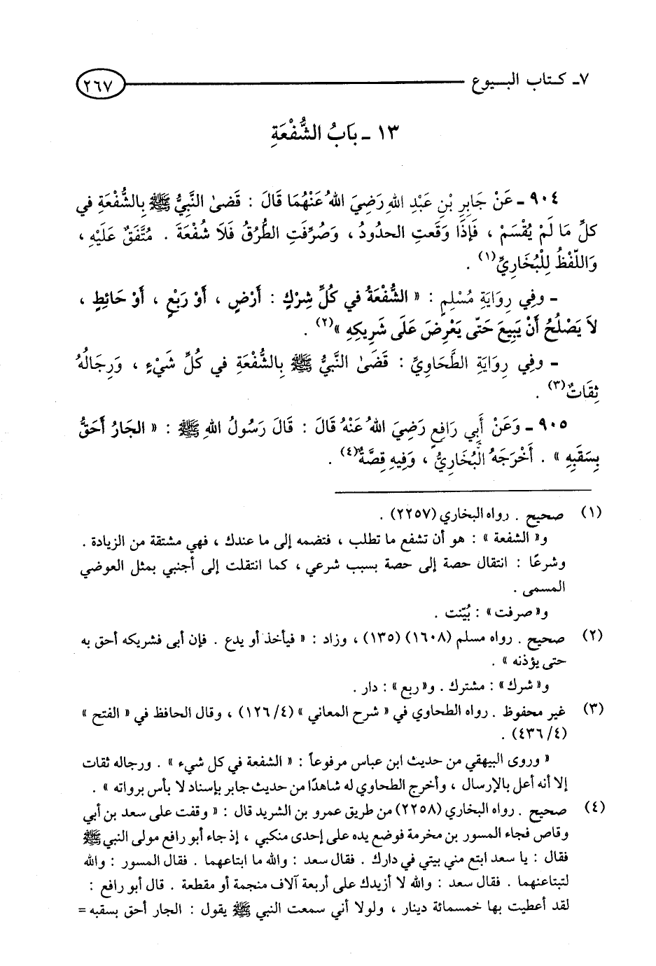 904 - عَنْ جَابِرِ بْنِ عَبْدِ اللَّهِ -رَضِيَ اللَّهُ عَنْهُمَا- قَالَ: قَضَى رَسُولُ اللَّهِ - صلى الله عليه وسلم - بِالشُّفْعَةِ فِي كُلِّ مَا لَمْ يُقْسَمْ, فَإِذَا وَقَعَتِ الْحُدُودُ وَصُرِّفَتْ الطُّرُقُ فَلَا شُفْعَةَ. مُتَّفَقٌ عَلَيْهِ, وَاللَّفْظُ لِلْبُخَارِيِّ. (1)
