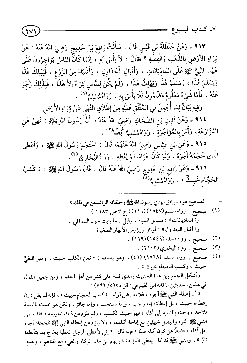 916 - وَعَنْ رَافِعِ بْنِ خَدِيجٍ - رضي الله عنه - قَالَ: قَالَ رَسُولُ اللَّهِ - صلى الله عليه وسلم: «كَسْبُ الْحَجَّامِ خَبِيثٌ». رَوَاهُ مُسْلِمٌ. (1)