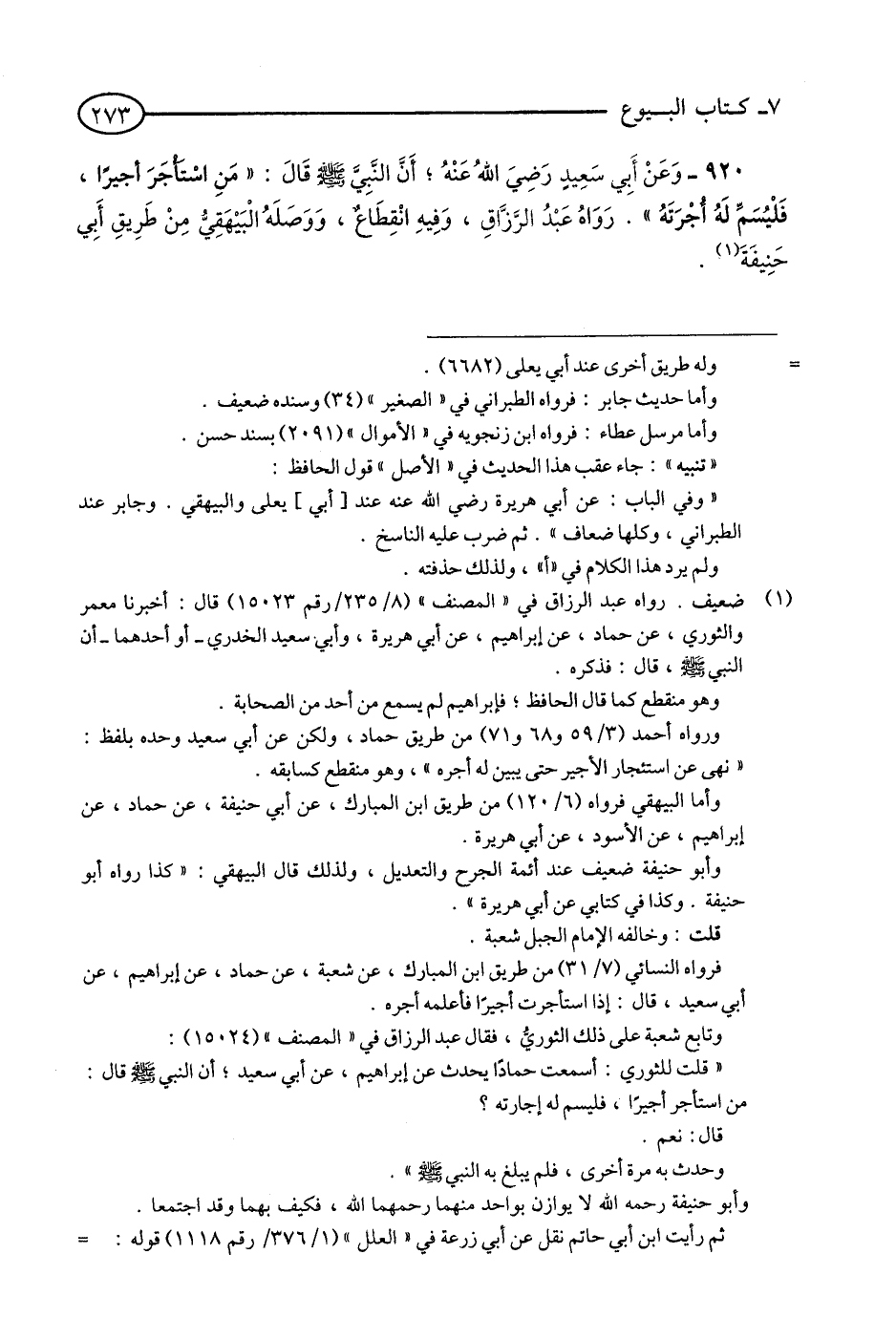 (1) - ضعيف. رواه عبد الرازق في «المصنف» (8/ 235 / رقم 15023) قال: أخبرنا معمر والثوري، عن حماد، عن إبراهيم، عن أبي هريرة، وأبي سعيد الخدري - أو أحدهما - أن النبي -صلى الله عليه وسلم-، قال: فذكره. وهو منقطع كما قال الحافظ، فإبراهيم لم يسمع من أحد من الصحابة. ورواه أحمد (3/ 59 و 68 و 71) من طريق حماد، ولكن عن أبي سعيد وحده بلفظ: «نهى عن استئجار الأجير حتى يبين له أجره «وهو منقطع كسابقه. وأما البيهقي فرواه (6/ 120) من طريق ابن المبارك، عن أبي حنيفة، عن حماد، عن إبراهيم، عن الأسود، عن أبي هريرة، وأبو حنيفة ضعيف عند أئمة الجرح والتعديل، ولذلك قال البيهقي: «كذا رواه أبو حنيفة. وكذا في كتابي عن أبي هريرة». قلت: وخالف الإمام الجبل شعبة. فرواه النسائي (7/ 31) من طريق ابن المبارك، عن شعبة، عن حماد، عن إبراهيم، عن أبي سعيد، قال: إذا استأجرت أجيرًا، فأعلمه أجره وتابع شعبة على ذلك الثوري، فقال عبد الرازق في «المصنف» (15024) «قلت للثوري: أسمعت حمادًا يحدث عن إبراهيم، عن أبي سعيد؛ أن النبي -صلى الله عليه وسلم- قال: من استأجر أجيرًا، فليُسَمِّ له إجارته؟ قال: نعم. وحدث به مرة أخرى، فلم يبلغ به النبي -صلى الله عليه وسلم». وأبو حنيفة -رحمه الله- لا يوازن بواحد منهما -رحمهما الله-، فكيف بهما وقد اجتمعا. ثم رأيت ابن أبي حاتم نقل عن أبي زُرعة في «العلل» (1/ 376 / رقم 1118) قوله: «الصحيح موقوف على أبي سعيد «فالحمد لله على توفيقه. قلت: ولا يفهم من قوله: «الصحيح» «أن الإسناد صحيح كما ذهب إلى ذلك الشيخ شُعَيْب الأرناؤوط في تعليقه على «المراسيل» ص (168)، إذ كيف يفهم ذلك، بينما الإنقطاع لم ينتف من السند؟، وإنما المراد أن راوية من رواه موقوفًا - بغضّ النظر عن صحة السند أو ضعفه - أصح من رواية من رفعه، وفي بقية كلام أبي زُرعة ما يوضح ذلك، إذ علّل رأيه السابق بقوله: «لأن الثوري أحفظ».