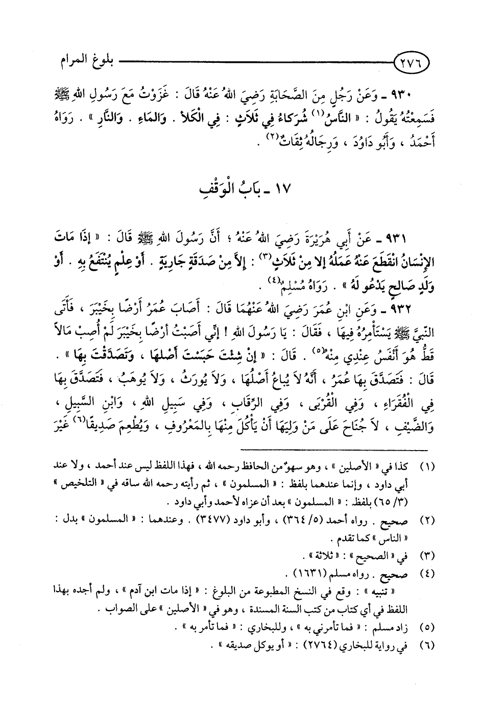 932 - وَعَنِ ابْنِ عُمَرَ - رَضِيَ اللَّهُ عَنْهُمَا - قَالَ: أَصَابَ عُمَرُ أَرْضًا بِخَيْبَرَ, فَأَتَى النَّبِيَّ - صلى الله عليه وسلم - يَسْتَأْمِرُهُ فِيهَا, فَقَالَ: يَا رَسُولَ اللَّهِ! إِنِّي أَصَبْتُ أَرْضًا بِخَيْبَرَ لَمْ أُصِبْ مَالًا قَطُّ هُوَ أَنْفَسُ عِنْدِي مِنْهُ (1) قَالَ: «إِنْ شِئْتَ حَبَسْتَ أَصْلَهَا, وَتَصَدَّقْتَ بِهَا». قَالَ: فَتَصَدَّقَ بِهَا عُمَرُ, [غَيْرَ] أَنَّهُ لَا يُبَاعُ أَصْلُهَا, وَلَا يُورَثُ, وَلَا يُوهَبُ, فَتَصَدَّقَ بِهَا فِي الْفُقَرَاءِ, وَفِي الْقُرْبَى, وَفِي الرِّقَابِ, وَفِي سَبِيلِ اللَّهِ, وَابْنِ السَّبِيلِ, وَالضَّيْفِ, لَا جُنَاحَ عَلَى مَنْ وَلِيَهَا أَنْ يَأْكُلَ مِنْهَا بِالْمَعْرُوفِ, وَيُطْعِمَ صَدِيقًا - (2) غَيْرَ -[277]- مُتَمَوِّلٍ مَالًا. (3) مُتَّفَقٌ عَلَيْهِ, وَاللَّفْظُ لِمُسْلِمٍ. (4)