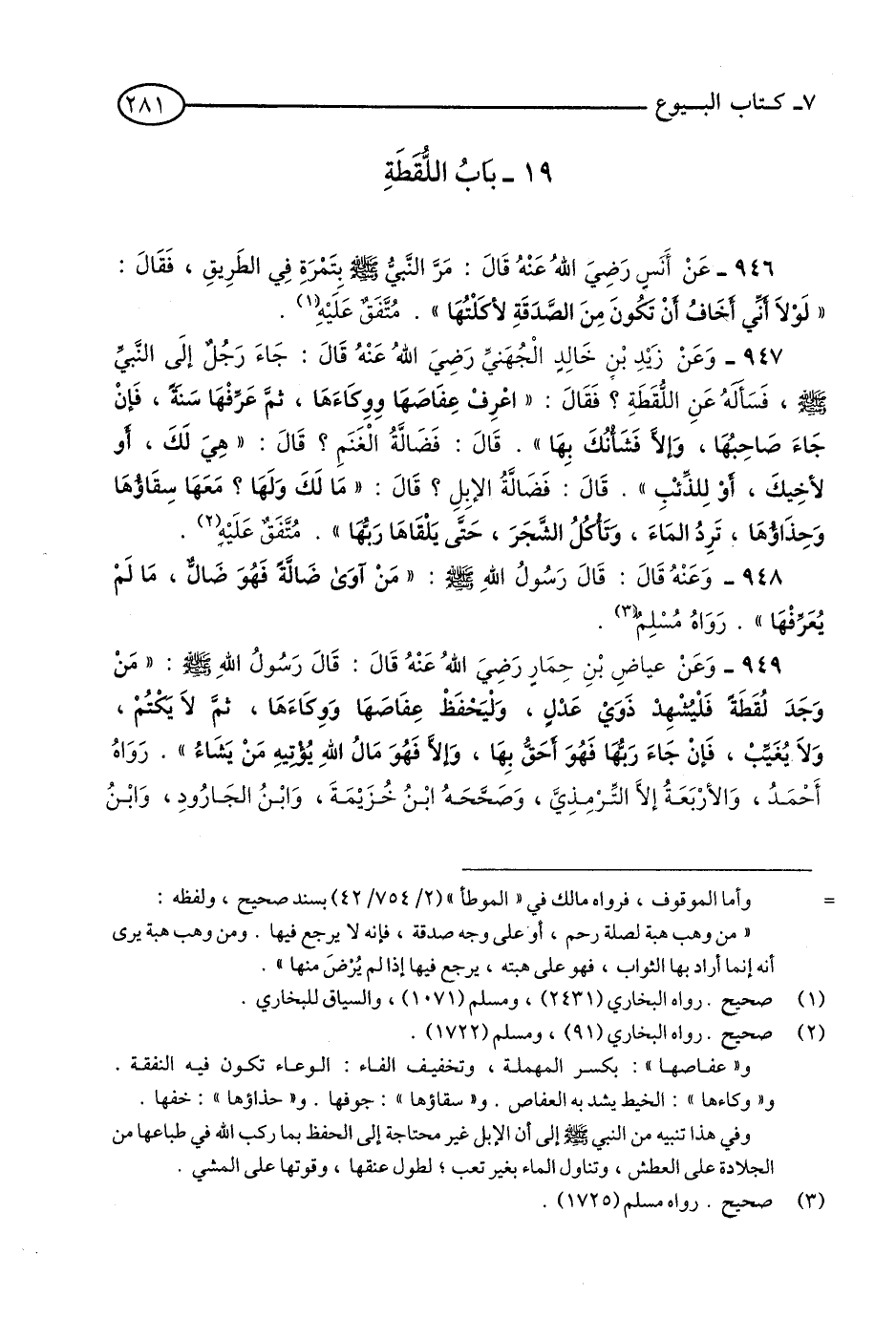 949 - وَعَنْ عِيَاضِ بْنِ حِمَارٍ - رضي الله عنه - قَالَ: قَالَ رَسُولُ اللَّهِ - صلى الله عليه وسلم: «مَنْ وَجَدَ لُقَطَةً فَلْيُشْهِدْ ذَوَيْ عَدْلٍ, وَلْيَحْفَظْ عِفَاصَهَا وَوِكَاءَهَا, ثُمَّ لَا يَكْتُمْ, وَلَا يُغَيِّبْ, فَإِنْ جَاءَ رَبُّهَا فَهُوَ أَحَقُّ بِهَا, وَإِلَّا فَهُوَ مَالُ اللَّهِ يُؤْتِيهِ مَنْ يَشَاءُ». رَوَاهُ أَحْمَدُ, وَالْأَرْبَعَةُ إِلَّا التِّرْمِذِيَّ, وَصَحَّحَهُ ابْنُ خُزَيْمَةَ, وَابْنُ الْجَارُودِ, وَابْنُ حِبَّانَ. (1)