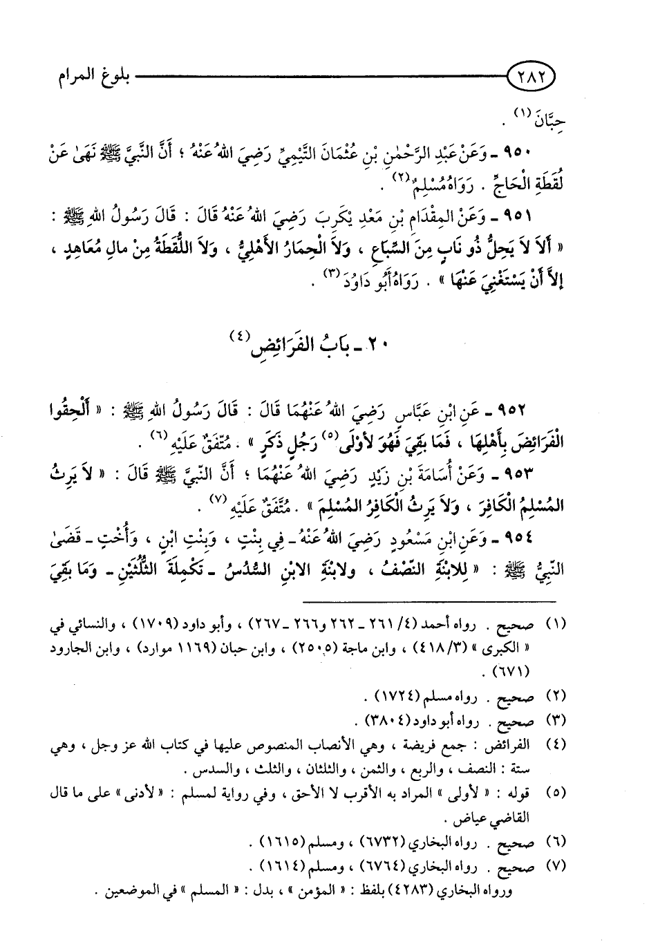 952 - عَنِ ابْنِ عَبَّاسٍ - رَضِيَ اللَّهُ عَنْهُمَا- قَالَ: قَالَ رَسُولُ اللَّهِ - صلى الله عليه وسلم: «أَلْحِقُوا الْفَرَائِضَ بِأَهْلِهَا, فَمَا بَقِيَ فَهُوَ لِأَوْلَى رَجُلٍ ذَكَرٍ». مُتَّفَقٌ عَلَيْهِ. (1)