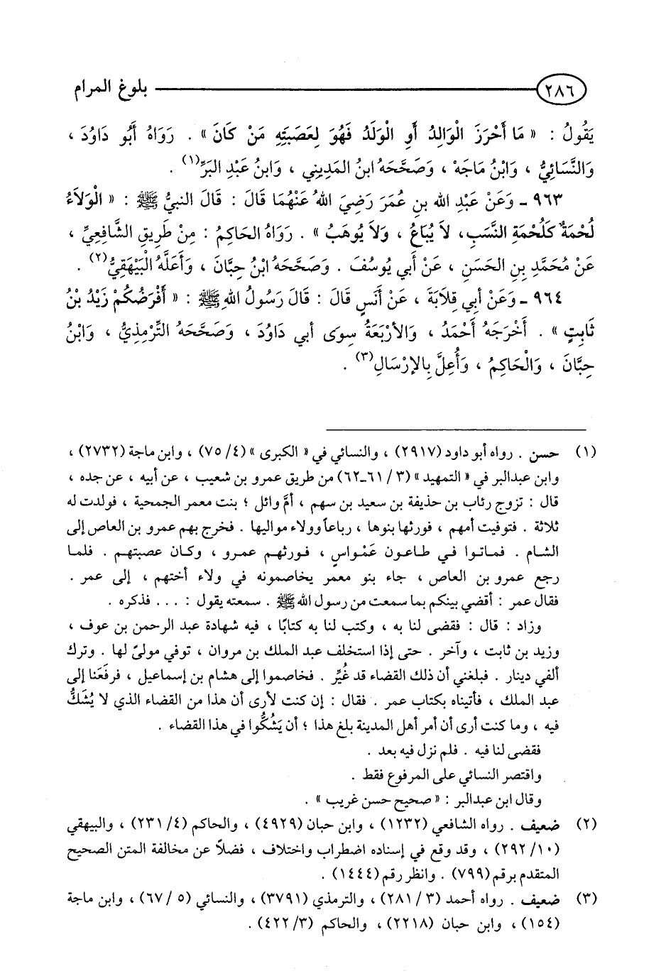 963 - وَعَنْ عَبْدِ اللَّهِ بْنِ عُمَرَ - رَضِيَ اللَّهُ عَنْهُمَا- قَالَ: قَالَ النَّبِيُّ - صلى الله عليه وسلم: «الْوَلَاءُ لُحْمَةٌ كَلُحْمَةِ النَّسَبِ, لَا يُبَاعُ, وَلَا يُوهَبُ». رَوَاهُ الْحَاكِمُ: مِنْ طَرِيقِ الشَّافِعِيِّ, عَنْ مُحَمَّدِ بْنِ الْحَسَنِ, عَنْ أَبِي يُوسُفَ، وَصَحَّحَهُ ابْنُ حِبَّانَ, وَأَعَلَّهُ الْبَيْهَقِيُّ. (1)