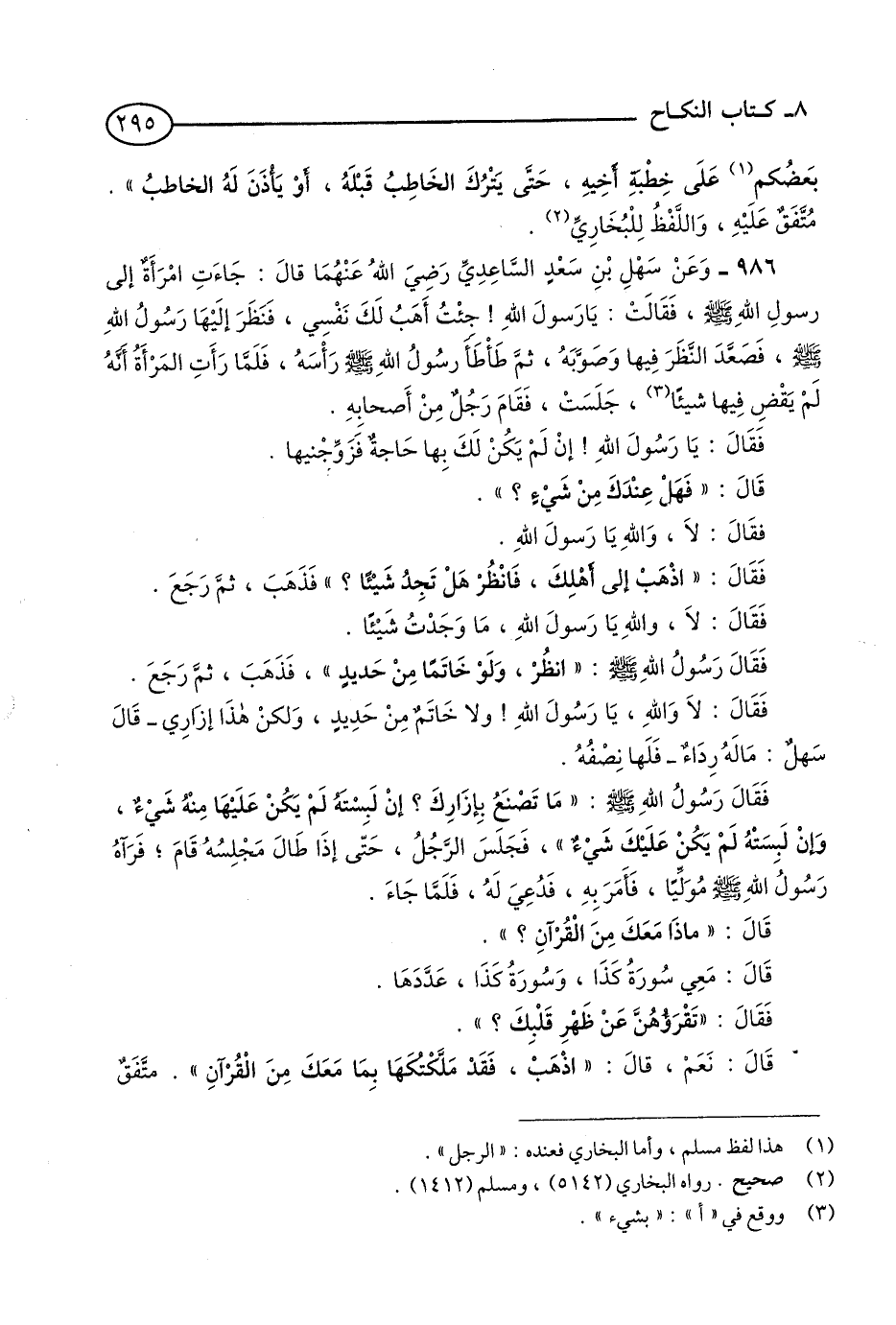 986 - وَعَنْ سَهْلِ بْنِ سَعْدٍ السَّاعِدِيِّ - رَضِيَ اللَّهُ عَنْهُمَا- قَالَ: جَاءَتِ امْرَأَةٌ إِلَى رَسُولِ اللَّهِ - صلى الله عليه وسلم - فَقَالَتْ: يَا رَسُولَ اللَّهِ! جِئْتُ أَهَبُ لَكَ نَفْسِي. فَنَظَرَ إِلَيْهَا رَسُولُ اللَّهِ - صلى الله عليه وسلم - فَصَعَّدَ النَّظَرَ فِيهَا, وَصَوَّبَهُ, ثُمَّ طَأْطَأَ رَسُولُ اللَّهِ - صلى الله عليه وسلم - رَأْسَهُ, فَلَمَّا رَأَتْ الْمَرْأَةُ أَنَّهُ لَمْ يَقْضِ فِيهَا شَيْئًا (1) جَلَسَتْ, فَقَامَ رَجُلٌ مِنْ أَصْحَابِهِ.