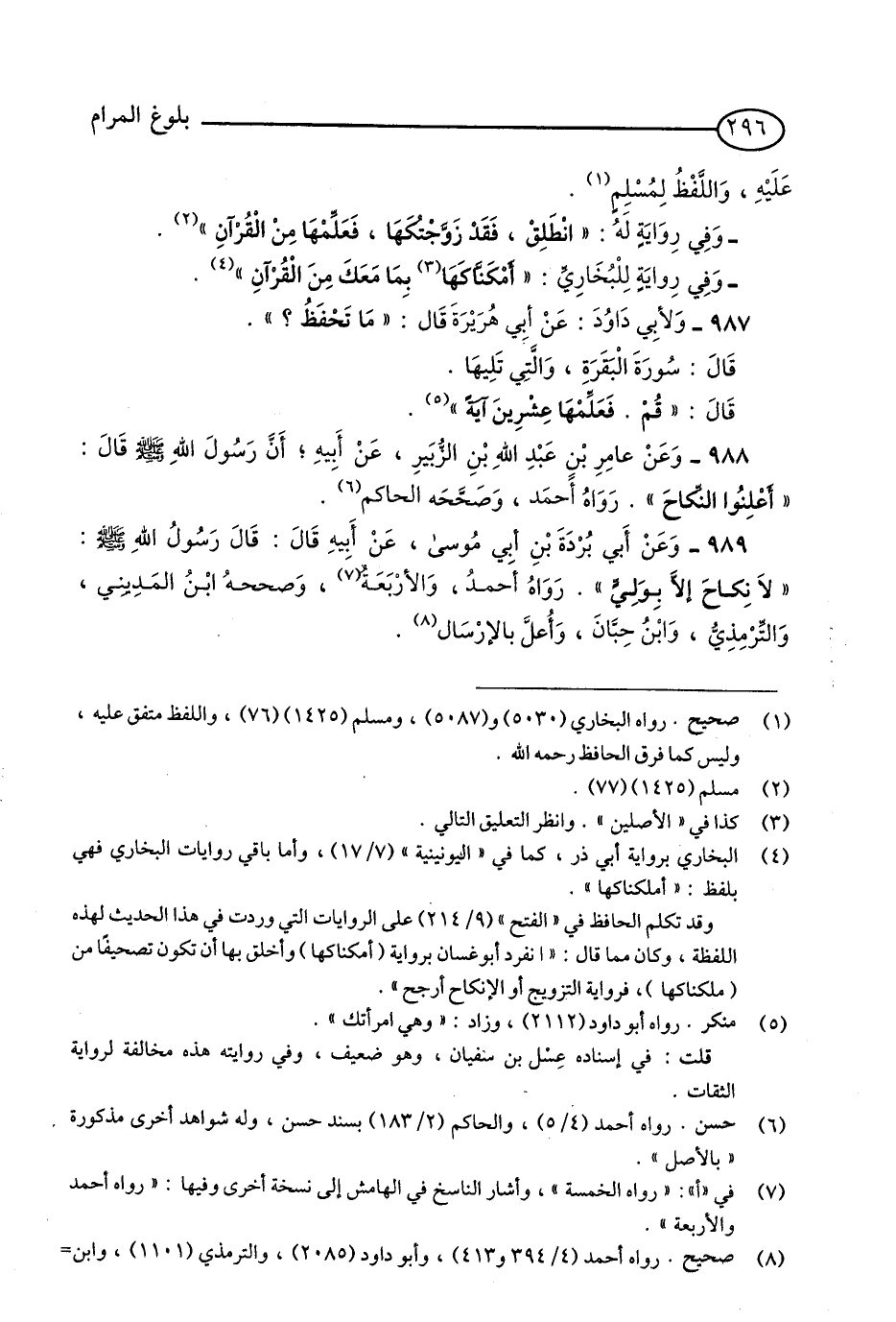 988 - وَعَنْ عَامِرِ بْنِ عَبْدِ اللَّهِ بْنِ الزُّبَيْرِ, عَنْ أَبِيهِ; أَنَّ رَسُولَ اللَّهِ - صلى الله عليه وسلم - قَالَ: «أَعْلِنُوا النِّكَاحَ». رَوَاهُ أَحْمَدُ, وَصَحَّحَهُ الْحَاكِمُ. (1)