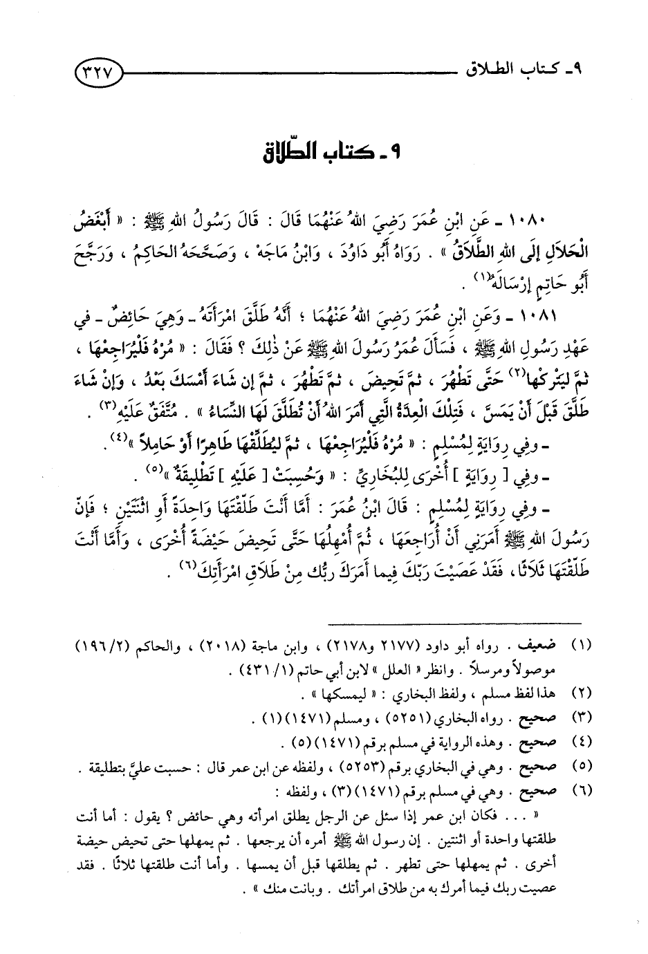 1080 - عَنِ اِبْنِ عُمَرَ - رَضِيَ اللَّهُ عَنْهُمَا- قَالَ: قَالَ رَسُولُ اللَّهِ - صلى الله عليه وسلم: «أَبْغَضُ الْحَلَالِ عِنْدَ اللَّهِ الطَّلَاقُ». رَوَاهُ أَبُو دَاوُدَ, وَابْنُ مَاجَهْ, وَصَحَّحَهُ الْحَاكِمُ, وَرَجَّحَ أَبُو حَاتِمٍ إِرْسَالَهُ. (1)