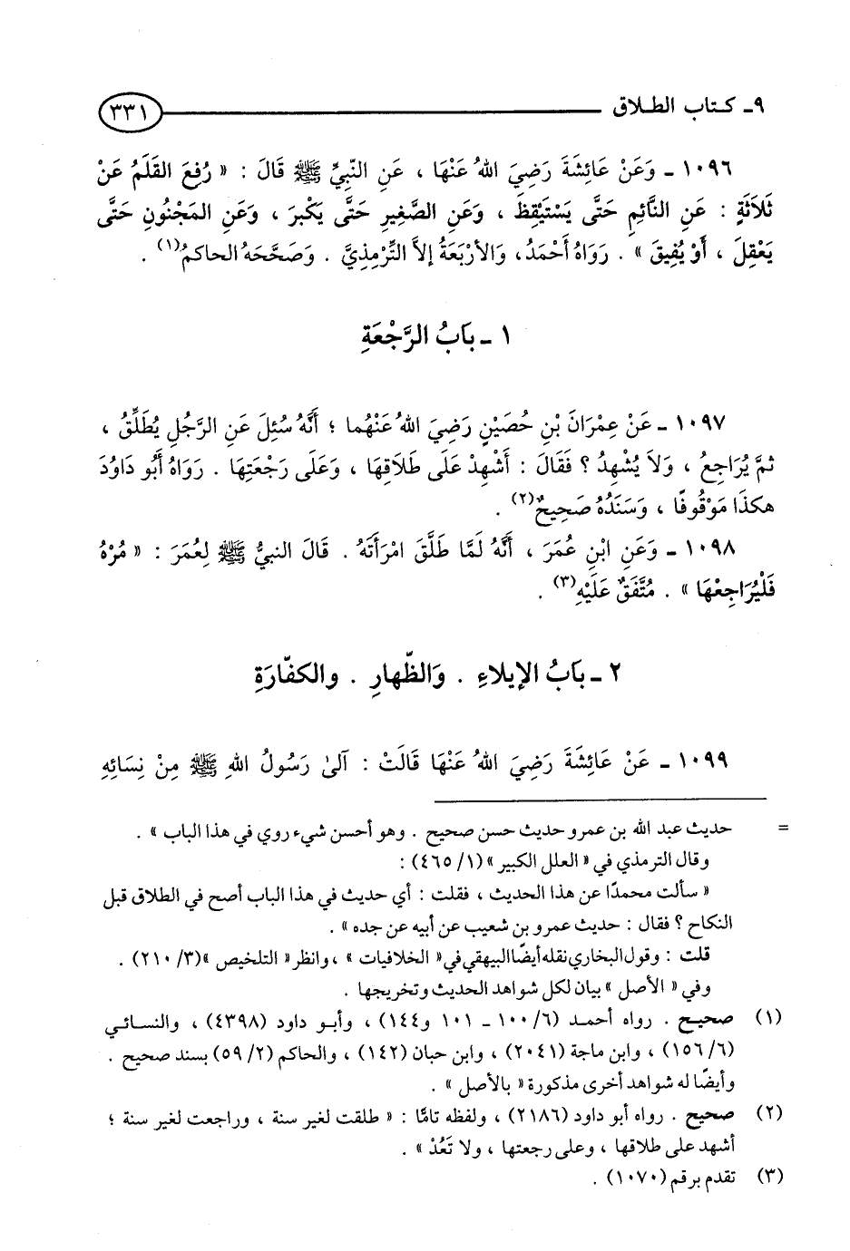 1097 - عَنْ عِمْرَانَ بْنِ حُصَيْنٍ رَضِيَ اللَّهُ عَنْهُمَا; أَنَّهُ سُئِلَ عَنْ الرَّجُلِ يُطَلِّقُ, ثُمَّ يُرَاجِعُ, وَلَا يُشْهِدُ? فَقَالَ: أَشْهِدْ عَلَى طَلَاقِهَا, وَعَلَى رَجْعَتِهَا. رَوَاهُ أَبُو دَاوُدَ هَكَذَا مَوْقُوفًا, وَسَنَدُهُ صَحِيحٌ. (1)