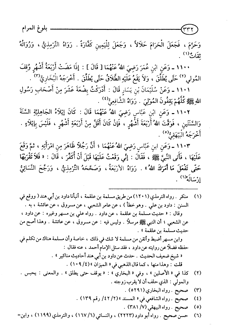 1100 - وَعَنِ ابْنِ عُمَرَ رَضِيَ اللَّهُ عَنْهُمَا قَالَ: إِذَا مَضَتْ أَرْبَعَةُ أَشْهُرٍ وُقِفَ الْمُؤْلِي (1) حَتَّى يُطَلِّقَ, وَلَا يَقَعُ عَلَيْهِ الطَّلَاقُ حَتَّى يُطَلِّقَ. أَخْرَجَهُ الْبُخَارِيُّ. (2)