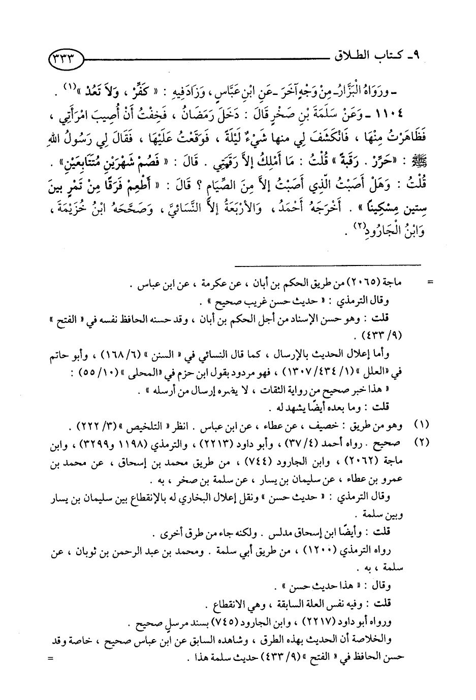 1104 - وَعَنْ سَلَمَةَ بْنِ صَخْرٍ قَالَ: دَخَلَ رَمَضَانُ, فَخِفْتُ أَنْ أُصِيبَ اِمْرَأَتِي, فَظَاهَرْتُ مِنْهَا, فَانْكَشَفَ لِي مِنْهَا شَيْءٌ لَيْلَةً, فَوَقَعَتْ عَلَيْهَا, فَقَالَ لِي رَسُولُ اللَّهِ - صلى الله عليه وسلم - «حَرِّرْ رَقَبَةً» قُلْتُ: مَا أَمْلِكُ إِلَّا رَقَبَتِي. قَالَ: «فَصُمْ شَهْرَيْنِ مُتَتَابِعَيْنِ»، قُلْتُ: وَهَلْ أَصَبْتُ الَّذِي أَصَبْتُ إِلَّا مِنْ الصِّيَامِ? قَالَ: «أَطْعِمْ عِرْقًا مِنْ تَمْرٍ بَيْنَ سِتِّينَ مِسْكِينًا». أَخْرَجَهُ أَحْمَدُ, وَالْأَرْبَعَةُ إِلَّا النَّسَائِيَّ, وَصَحَّحَهُ ابْنُ خُزَيْمَةَ, وَابْنُ الْجَارُودِ. (1)