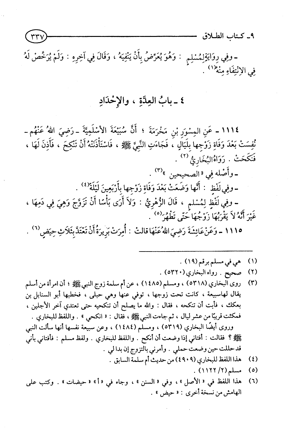 1114 - عَنْ الْمِسْوَرِ بْنِ مَخْرَمَةَ - رضي الله عنه: أَنَّ سُبَيْعَةَ الْأَسْلَمِيَّةَ - رَضِيَ اللَّهُ عَنْهَا - نُفِسَتْ بَعْدَ وَفَاةِ زَوْجِهَا بِلَيَالٍ, فَجَاءَتْ النَّبِيَّ - صلى الله عليه وسلم - فَاسْتَأْذَنَتْهُ أَنْ تَنْكِحَ, فَأَذِنَ لَهَا, فَنَكَحَتْ. رَوَاهُ الْبُخَارِيُّ (1)