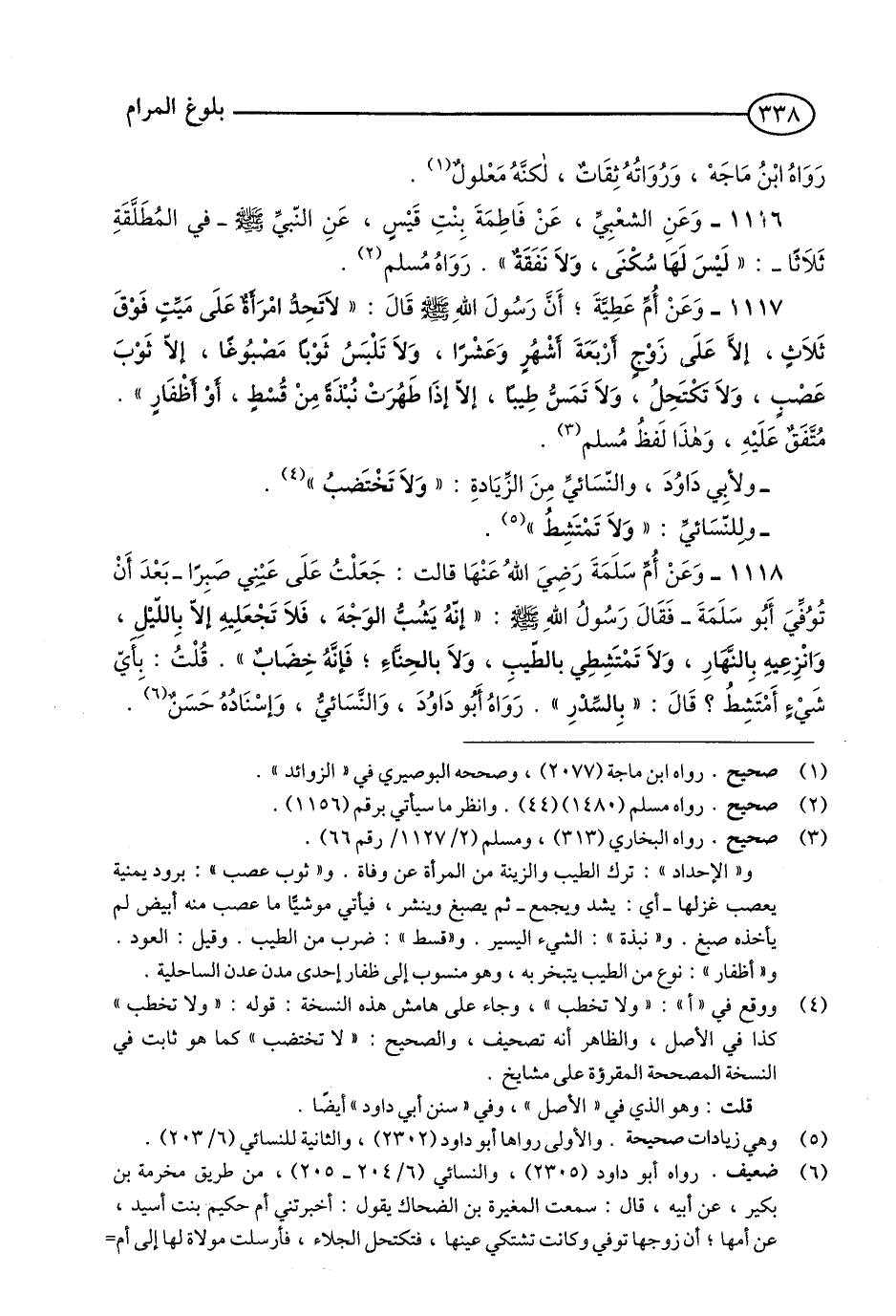 1118 - وَعَنْ أُمِّ سَلَمَةَ رَضِيَ اللَّهُ عَنْهَا قَالَتْ: جَعَلْتُ عَلَى عَيْنِي صَبْرًا, بَعْدَ أَنْ تُوُفِّيَ أَبُو سَلَمَةَ, فَقَالَ رَسُولُ اللَّهِ - صلى الله عليه وسلم: «إِنَّهُ يَشِبُ الْوَجْهَ, فَلَا تَجْعَلِيهِ إِلَّا بِاللَّيْلِ, وَانْزِعِيهِ بِالنَّهَارِ, وَلَا تَمْتَشِطِي بِالطِّيبِ, وَلَا بِالْحِنَّاءِ, فَإِنَّهُ خِضَابٌ». قُلْتُ: بِأَيِّ شَيْءٍ أَمْتَشِطُ? قَالَ: «بِالسِّدْرِ». رَوَاهُ أَبُو دَاوُدَ, وَالنَّسَائِيُّ, وَإِسْنَادُهُ حَسَنٌ. (1)