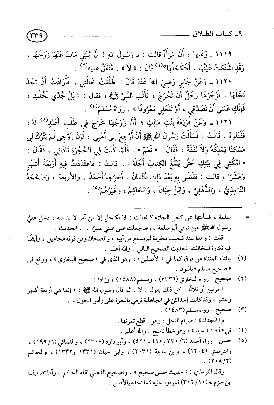 1121 - وَعَنْ فُرَيْعَةَ بِنْتِ مَالِكٍ: أَنَّ زَوْجَهَا خَرَجَ فِي طَلَبِ أَعْبُدٍ (1) لَهُ، فَقَتَلُوهُ. قَالَتْ: فَسَأَلْتُ النَّبِيَّ - صلى الله عليه وسلم - أَنْ أَرْجِعَ إِلَى أَهْلِي; فَإِنَّ زَوْجِي لَمْ يَتْرُكْ لِي مَسْكَنًا يَمْلِكُهُ وَلَا نَفَقَةً, فَقَالَ: «نَعَمْ». فَلَمَّا كُنْتُ فِي الْحُجْرَةِ نَادَانِي, فَقَالَ: «امْكُثِي فِي بَيْتِكِ حَتَّى يَبْلُغَ الْكِتَابُ أَجَلَهُ». قَالَتْ: فَاعْتَدَدْتُ فِيهِ أَرْبَعَةَ أَشْهُرٍ وَعَشْرًا, قَالَتْ: فَقَضَى بِهِ بَعْدَ ذَلِكَ عُثْمَانُ. أَخْرَجَهُ أَحْمَدُ, وَالْأَرْبَعَةُ, وَصَحَّحَهُ التِّرْمِذِيُّ, والذُّهْلِيُّ, وَابْنُ حِبَّانَ, وَالْحَاكِمُ وَغَيْرُهُمْ. (2)