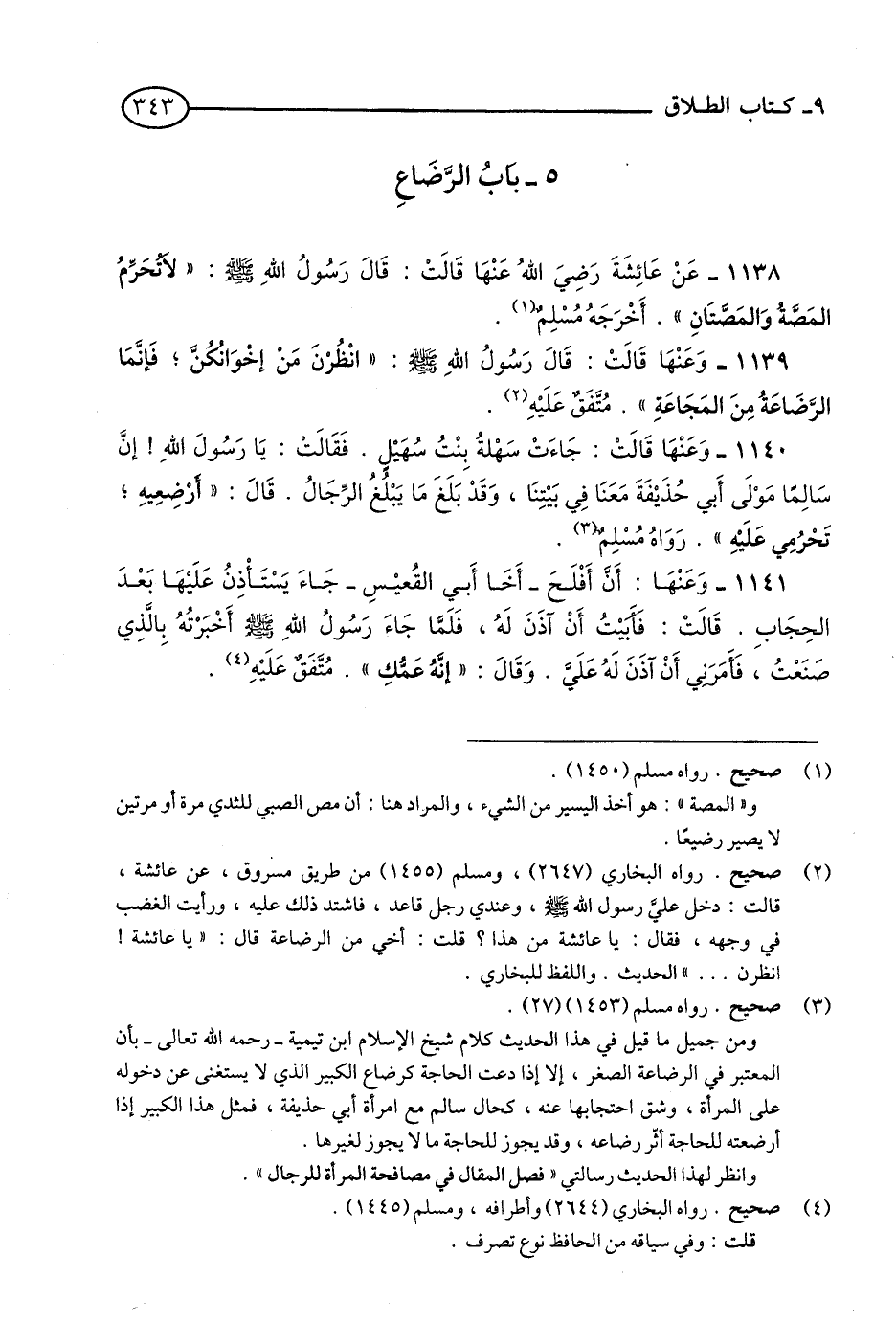1138 - عَنْ عَائِشَةَ رَضِيَ اللَّهُ عَنْهَا قَالَتْ: قَالَ رَسُولُ اللَّهِ - صلى الله عليه وسلم: «لَا تُحَرِّمُ الْمَصَّةُ وَالْمَصَّتَانِ». أَخْرَجَهُ مُسْلِمٌ. (1)