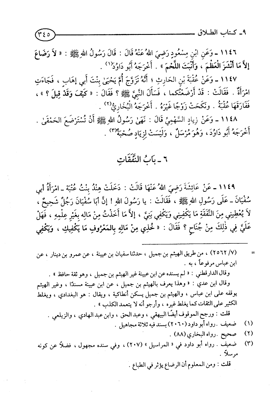 1149 - عَنْ عَائِشَةَ رَضِيَ اللَّهُ عَنْهَا قَالَتْ: دَخَلَتْ هِنْدُ بِنْتُ عُتْبَةَ -امْرَأَةُ أَبِي سُفْيَانَ- عَلَى رَسُولِ اللَّهِ - صلى الله عليه وسلم -. فَقَالَتْ: يَا رَسُولَ اللَّهِ! إِنَّ أَبَا سُفْيَانَ رَجُلٌ شَحِيحٌ لَا يُعْطِينِي مِنَ النَّفَقَةِ مَا يَكْفِينِي وَيَكْفِي بَنِيَّ إِلَّا مَا أَخَذْتُ مِنْ مَالِهِ بِغَيْرِ عِلْمِهِ, فَهَلْ عَلَيَّ فِي ذَلِكَ مِنْ جُنَاحٍ? فَقَالَ: «خُذِي مِنْ مَالِهِ بِالْمَعْرُوفِ مَا يَكْفِيكِ, وَيَكْفِي بَنِيكِ». مُتَّفَقٌ عَلَيْهِ. (1)