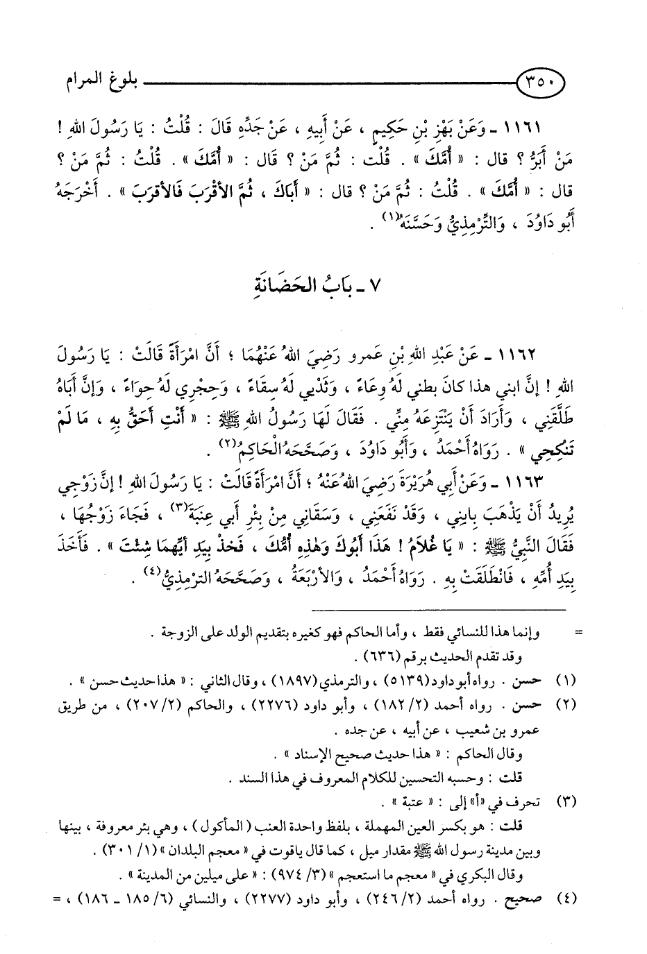 1162 - عَنْ عَبْدِ اللَّهِ بْنِ عَمْرِوٍ رَضِيَ اللَّهُ عَنْهُمَا; أَنَّ اِمْرَأَةً قَالَتْ: يَا رَسُولَ اللَّهِ! إِنَّ ابْنِي هَذَا كَانَ بَطْنِي لَهُ وِعَاءً, وَثَدْيِي لَهُ سِقَاءً, وَحِجْرِي لَهُ حِوَاءً, وَإِنَّ أَبَاهُ طَلَّقَنِي, وَأَرَادَ أَنْ يَنْتَزِعَهُ مِنِّي. فَقَالَ لَهَا رَسُولُ اللَّهِ - صلى الله عليه وسلم: «أَنْتِ أَحَقُّ بِهِ, مَا لَمْ تَنْكِحِي». رَوَاهُ أَحْمَدُ, وَأَبُو دَاوُدَ, وَصَحَّحَهُ الْحَاكِمُ. (1)