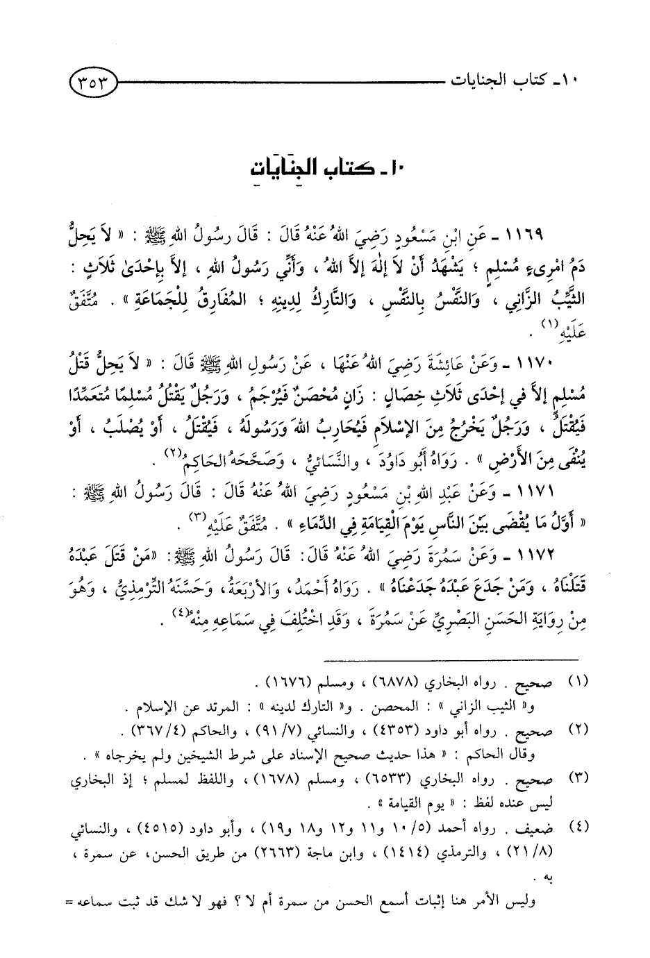 1169 - عَنِ ابْنِ مَسْعُودٍ - رضي الله عنه - قَالَ: قَالَ رَسُولُ اللَّهِ - صلى الله عليه وسلم: «لَا يَحِلُّ دَمُ امْرِئٍ مُسْلِمٍ; يَشْهَدُ أَنْ لَا إِلَهَ إِلَّا اللَّهُ, وَأَنِّي رَسُولُ اللَّهِ, إِلَّا بِإِحْدَى ثَلَاثٍ: الثَّيِّبُ الزَّانِي, وَالنَّفْسُ بِالنَّفْسِ, وَالتَّارِكُ لِدِينِهِ; الْمُفَارِقُ لِلْجَمَاعَةِ». مُتَّفَقٌ عَلَيْهِ. (1)