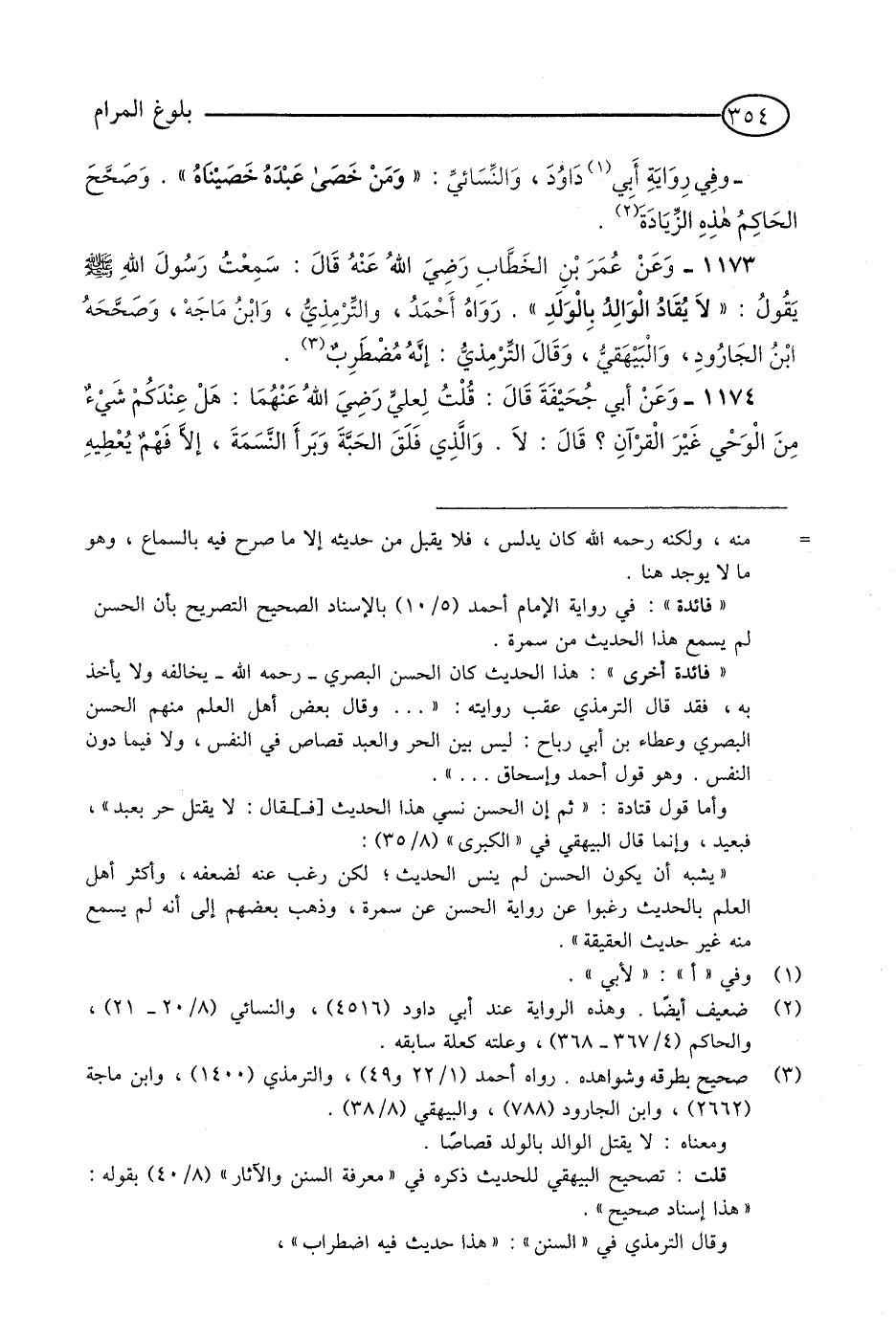 1173 - وَعَنْ عُمَرَ بْنِ الْخَطَّابِ - رضي الله عنه - قَالَ: سَمِعْتُ رَسُولَ اللَّهِ - صلى الله عليه وسلم - يَقُولُ: «لَا يُقَادُ الْوَالِدُ بِالْوَلَدِ». رَوَاهُ أَحْمَدُ, وَالتِّرْمِذِيُّ, وَابْنُ مَاجَهْ, وَصَحَّحَهُ ابْنُ الْجَارُودِ وَالْبَيْهَقِيُّ, وَقَالَ التِّرْمِذِيُّ: إِنَّهُ مُضْطَرِبٌ (1)