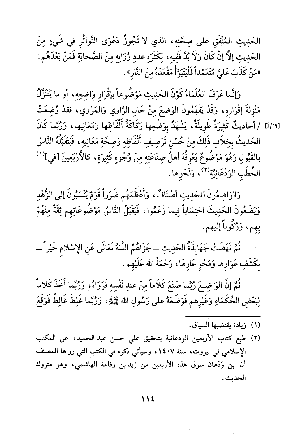 والواضعون للحديث أصنافٌ، وأعظمهم ضرراً قومٌ ينسبون إلى الزهد ويضعون الحديث احتساباً فيما زعموا، فيقبل الناس موضوعاتهم ثقةً منهم بهم، وركوناً إليهم.