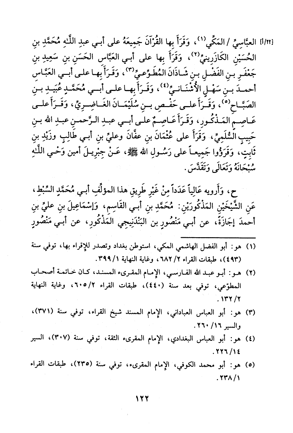 العباسي المكي، وقرأ بها القرآن جميعه على أبي عبد الله محمد بن الحسين الكازريني، وقرأ بها على أبي العباس الحسن بن سعيد بن جعفر بن الفضل بن شاذان المطوعي، وقرأ بها على أبي العباس أحمد بن سهل الأشناني، وقرأ بها على أبي محمدٍ عبيد بن الصباح، وقرأ على حفص بن سليمان الغاضري، وقرأ على عاصم المذكور، وقرأ عاصمٌ على أبي عبد الرحمن عبد الله بن حبيب السلمي، وقرأ على عثمان بن عفان وعلي بن أبي طالبٍ وزيد بن ثابتٍ، وقرؤوا جميعاً على رسول الله صلى الله عليه وسلم، عن جبريل أمين وحي الله سبحانه وتعالى وتقدس.