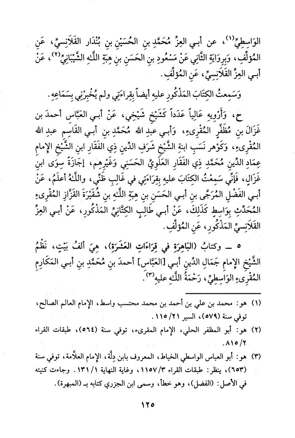 ح، وأرويه عالياً عدداً كشيخ شيخي، عن أبي العباس أحمد بن غزال بن مظفرٍ المقرئ، وأبي عبد الله محمد بن أبي القاسم عبد الله المقرئ، وكوهر نسب ابنة الشيخ شرف الدين ذي الفقار ابن الشيخ الإمام عماد الدين محمد ذي الفقار العلوي الحسني وغيرهم، إجازةً سوى ابن غزالٍ، فإني سمعت الكتاب عليه بقراءتي في غالب ظني، والله أعلم، عن أبي الفضل المرجى بن أبي الحسن بن هبة الله بن شقيرة القزاز المقرئ المحدث بواسط كذلك، عن أبي طالب الكتاني المذكور، عن أبي العز القلانسي المذكور، عن المؤلف.