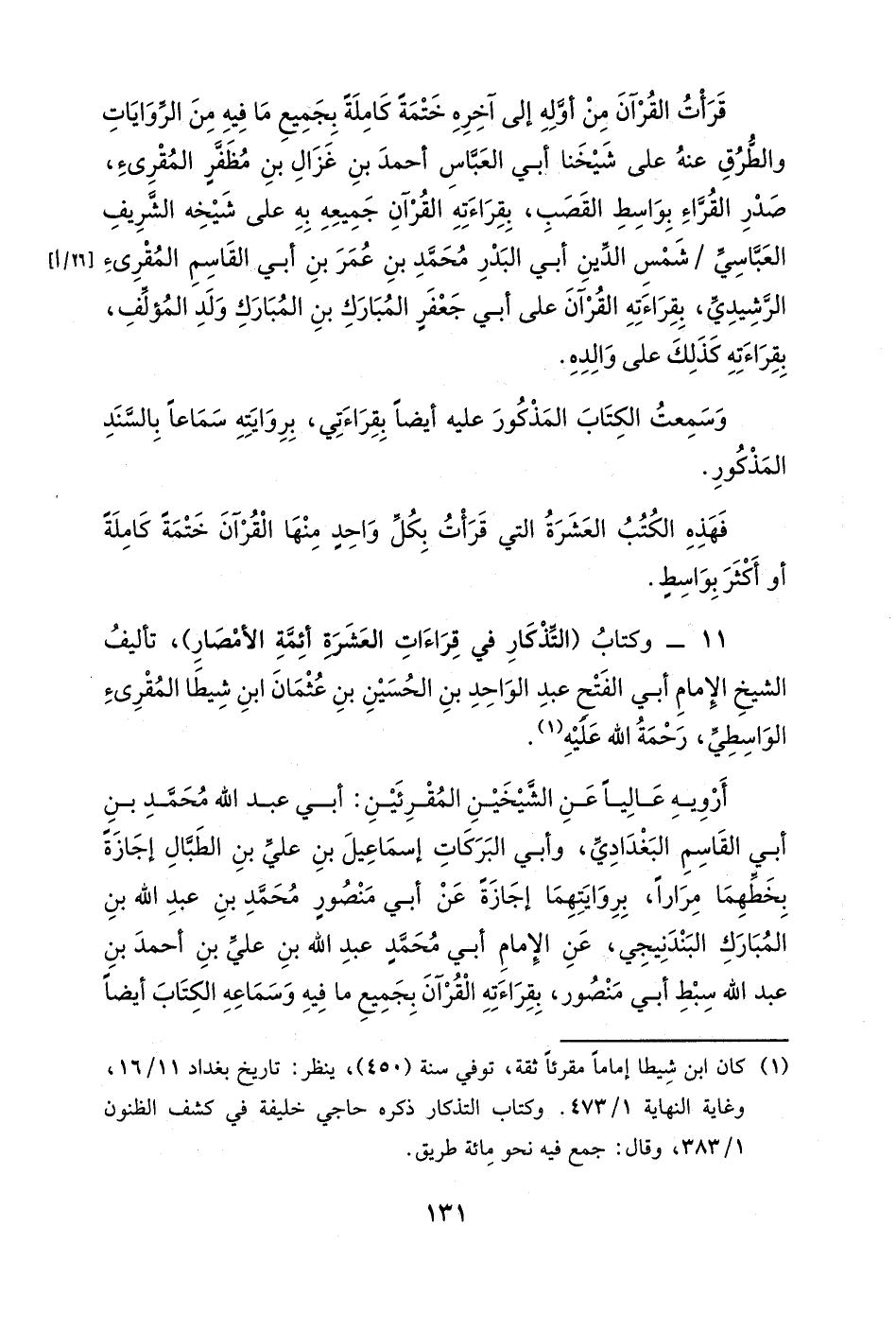 قرأت القرآن من أوله إلى آخره ختمةً كاملةً بجميع ما فيه من الروايات والطرق عنه على شيخنا أبي العباس أحمد بن غزال بن مظفر المقرئ، صدر القراء بواسط القصب، بقراءته القرآن جميعه به على شيخه الشريف العباسي شمس الدين أبي البدر محمد بن عمر بن أبي القاسم المقرئ الرشيدي، بقراءته القرآن على أبي جعفرٍ المبارك بن المبارك ولد المؤلف، بقراءته كذلك على والده.