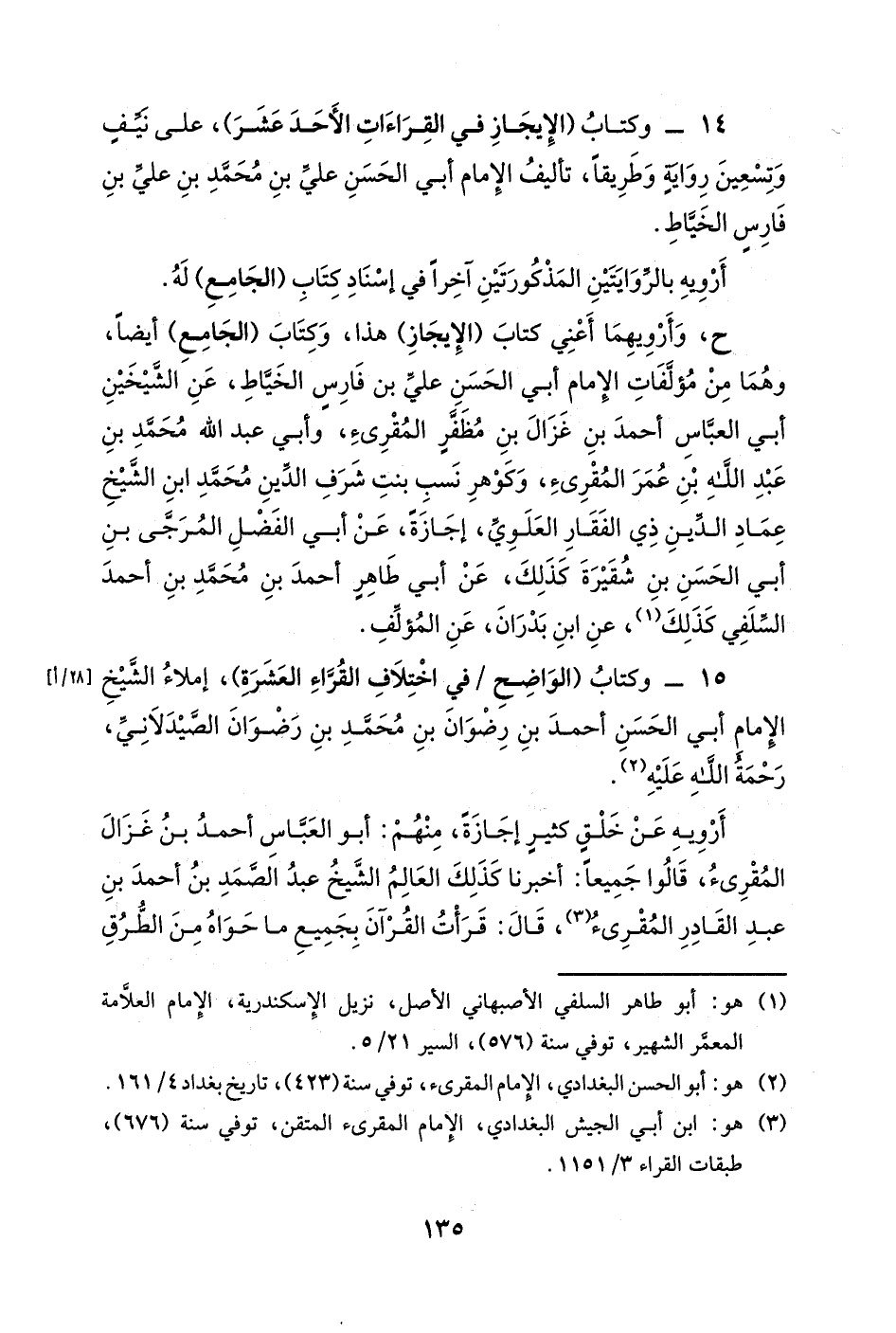 14- وكتاب (الإيجاز في القراءات الأحد عشر) ، على نيف وتسعين روايةٍ وطريقاً، تأليف الإمام أبي الحسن علي بن محمد بن علي بن فارسٍ الخياط.