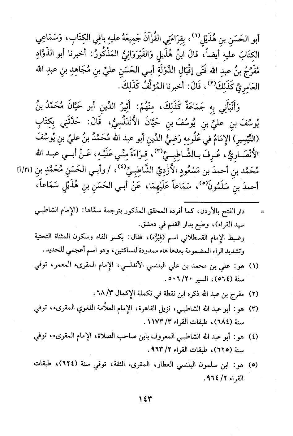 وأنبأني به جماعةٌ كذلك، منهم: أثير الدين أبو حيان محمد بن يوسف بن علي بن يوسف بن حيان الأندلسي، قال: حدثني بكتاب (التيسير) الإمام في علومه رضي الدين أبو عبد الله محمد بن علي بن يوسف الأنصاري، عرف بالشاطبي، قراءةً مني عليه، عن أبي عبد الله محمد بن أحمد بن مسعود الأزدي الشاطبي، وأبي الحسن محمد بن أحمد بن سلمون، سماعاً عليهما، عن أبي الحسن بن هذيل سماعاً،