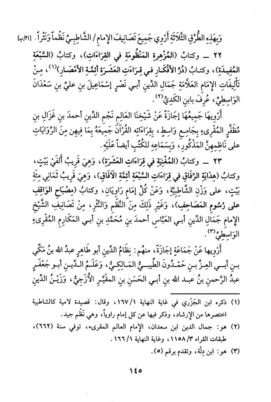 23- وكتاب (المغنية في قراءات العشرة) ، وهي قريب ألفي بيتٍ، وكتاب (هداية الرفاق في قراءات السبعة أئمة الآفاق) ، وهي قريب ثماني مئة بيتٍ، على وزن الشاطبية، وعن كل إمام راويان، وكتاب (مصباح الواقف على رسوم المصاحف) ، وغير ذلك من النظم والنثر، من تصانيف الشيخ الإمام جمال الدين أبي العباس أحمد بن محمد بن أبي المكارم المقرئ الواسطي.