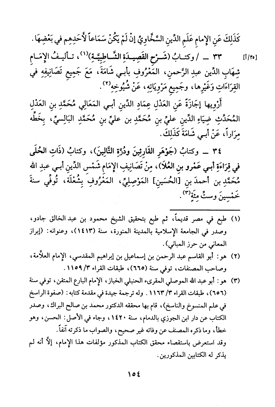 34- وكتاب (جوهر القارئين ودرة التالين) ، وكتاب (ذات الحلى قي قراءة أبي عمرو بن العلا) ، من تصانيف الإمام شمس الدين أبي عبد الله محمد بن أحمد بن [الحسين] الموصلي، المعروف بشعلة، توفي سنة خمسين وست مئةٍ.