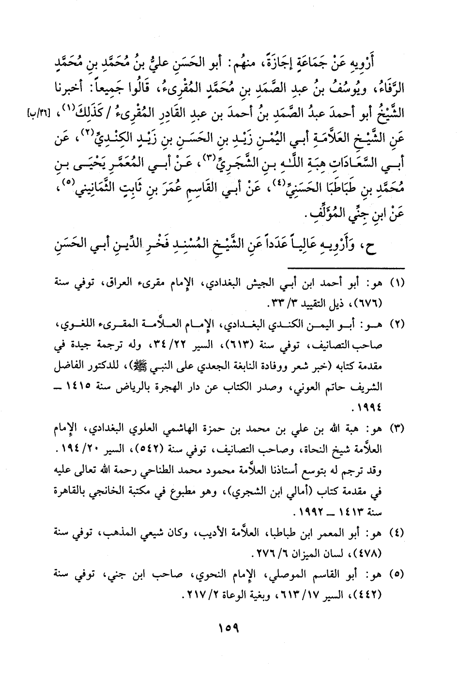 أرويه عن جماعةٍ إجازةً، منهم: أبو الحسن علي بن محمد بن محمد الرفاء، ويوسف بن عبد الصمد بن محمد المقرئ، قالوا جميعاً: أخبرنا الشيخ أبو أحمد عبد الصمد بن أحمد بن عبد القادر المقرئ كذلك، عن الشيخ العلامة أبي اليمن زيد بن الحسن بن زيد الكندي، عن أبي السعادات هبة الله بن الشجري، عن أبي المعمر يحيى بن محمد بن طباطبا الحسني، عن أبي القاسم عمر بن ثابتٍ الثمانيني، عن ابن جني المؤلف.