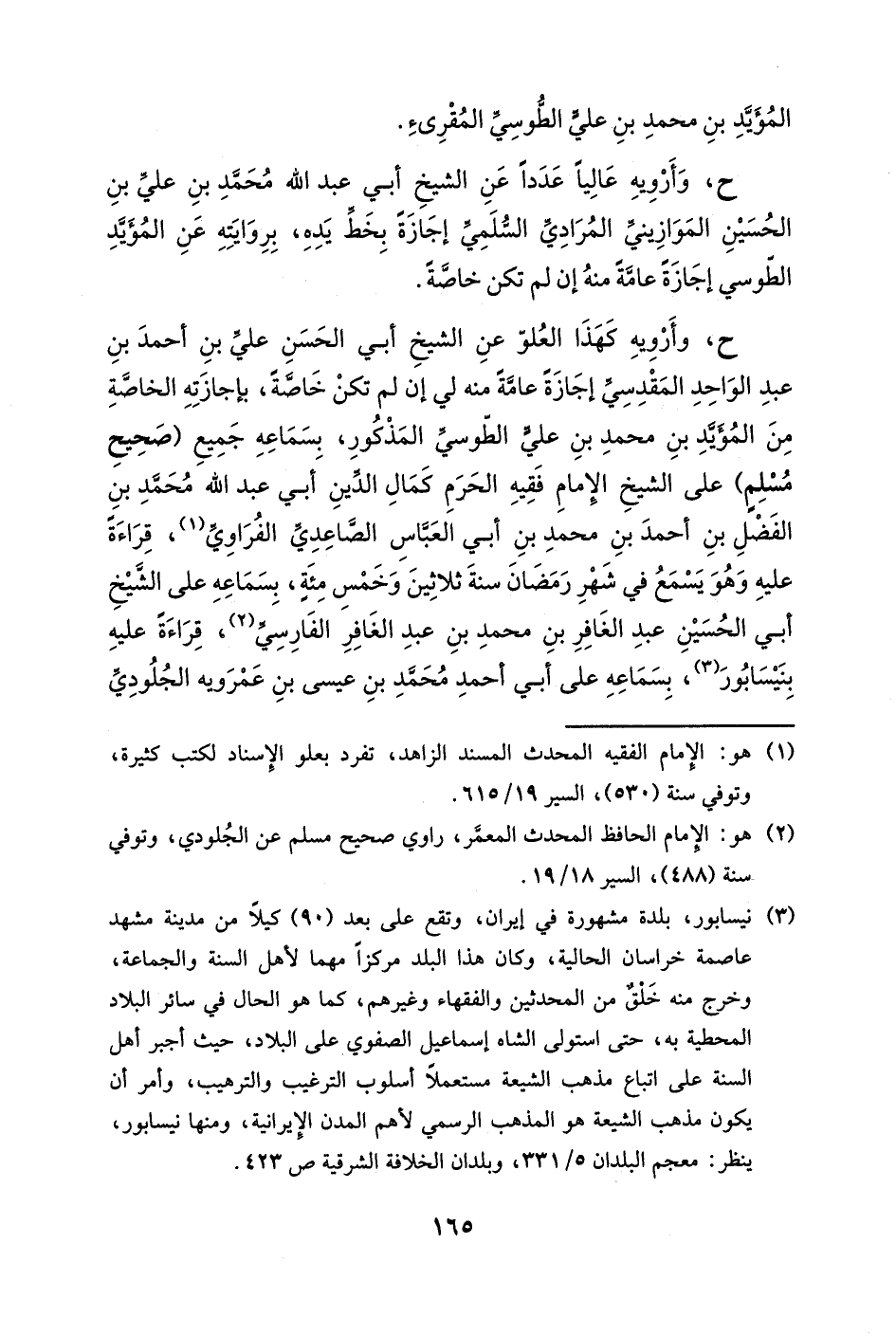 ح، وأرويه كهذا العلو عن الشيخ أبي الحسن علي بن أحمد بن عبد الواحد المقدسي إجازةً عامةً منه لي إن لم تكن خاصةً، بإجازته الخاصة من المؤيد بن محمد بن علي الطوسي المذكور، بسماعه جميع (صحيح مسلمٍ) على الشيخ الإمام فقيه الحرم كمال الدين أبي عبد الله محمد بن الفضل بن أحمد بن محمد بن أبي العباس الصاعدي الفراوي، قراءةً عليه وهو يسمع في شهر رمضان سنة ثلاثين وخمس مئةٍ، بسماعه على الشيخ أبي الحسين عبد الغافر بن محمد بن عبد الغافر الفارسي، قراءةً عليه بنيسابور، بسماعه على أبي أحمد محمد بن عيسى بن عمرويه الجلودي