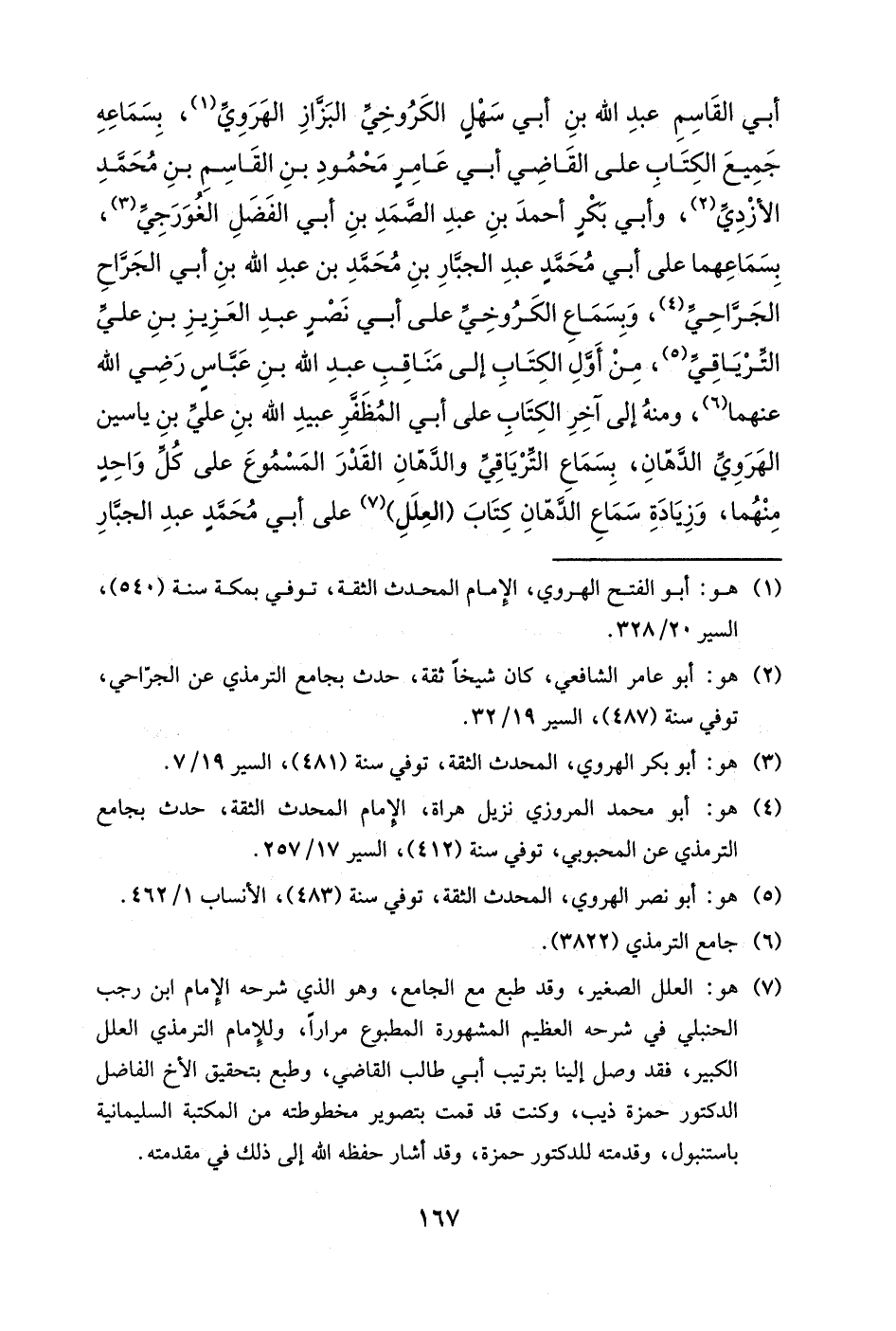 أبي القاسم عبد الله بن أبي سهلٍ الكروخي البزاز الهروي، بسماعه جميع الكتاب على القاضي أبي عامرٍ محمود بن القاسم بن محمد الأزدي، وأبي بكرٍ أحمد بن عبد الصمد بن أبي الفضل الغورجي، بسماعهما على أبي محمدٍ عبد الجبار بن محمد بن عبد الله بن أبي الجراح الجراحي، وبسماع الكروخي على أبي نصرٍ عبد العزيز بن علي الترياقي، من أول الكتاب إلى مناقب عبد الله بن عباس رضي الله عنهما، ومنه إلى آخر الكتاب على أبي المظفر عبيد الله بن علي بن ياسين الهروي الدهان، بسماع الترياقي والدهان القدر المسموع على كل واحدٍ منهما، وزيادةٍ سماع الدهان كتاب (العلل) على أبي محمدٍ عبد الجبار