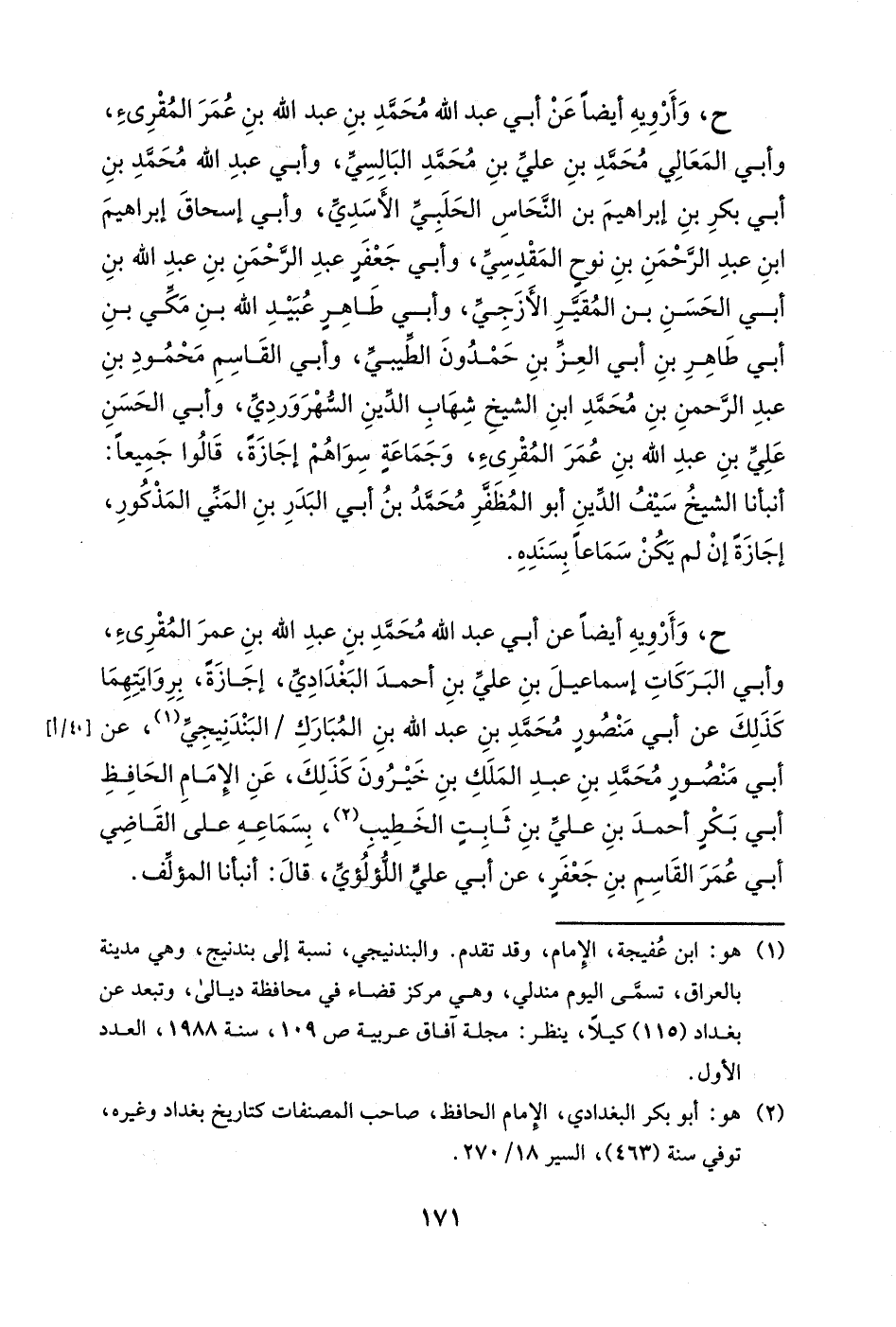 ح، وأرويه أيضاً عن أبي عبد الله محمد بن عبد الله بن عمر المقرئ، وأبي البركات إسماعيل بن علي بن أحمد البغدادي، إجازةً، بروايتهما كذلك عن أبي منصورٍ محمد بن عبد الله بن المبارك البندنيجي، عن أبي منصورٍ محمد بن عبد الملك بن خيرون كذلك، عن الإمام الحافظ أبي بكر أحمد بن علي بن ثابت الخطيب، بسماعه على القاضي أبي عمر القاسم بن جعفر، عن أبي علي اللؤلؤي، قال: أنبأنا المؤلف.