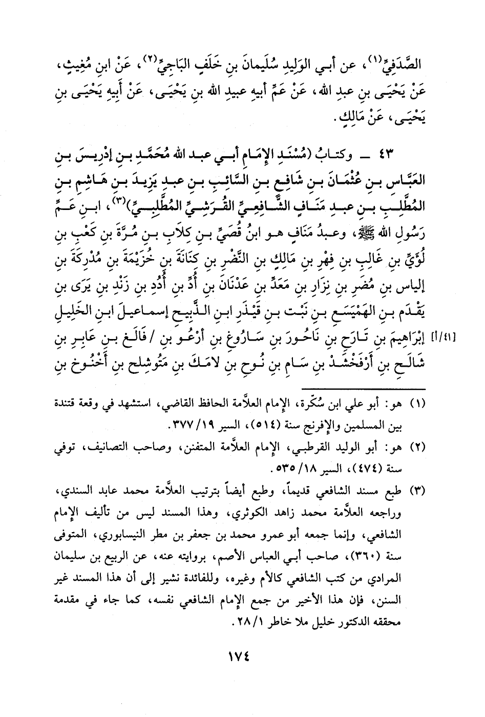 43- وكتاب (مسند الإمام أبي عبد الله محمد بن إدريس بن العباس بن عثمان بن شافع بن السائب بن عبد يزيد بن هاشم بن المطلب بن عبد منافٍ الشافعي القرشي المطلبي) ، ابن عم رسول الله صلى الله عليه وسلم، وعبد منافٍ هو ابن قصي بن كلاب بن مرة بن كعب لؤي بن غالب بن فهر بن مالكٍ بن النضر بن كنانة بن خزيمة بن مدركة بن إلياس بن مضر بن نزار بن معد بن عدنان بن أد بن أدد بن زند بن يرى بن يقدم بن الهميسع بن نبت بن قيذر ابن الذبيح إسماعيل ابن الخليل إبراهيم بن تارح بن ناحور بن ساروغ بن أرعو بن فالغ بن عابر بن شالح بن أرفخشد بن سام بن نوح بن لامك بن متوشلح بن أخنوخ بن