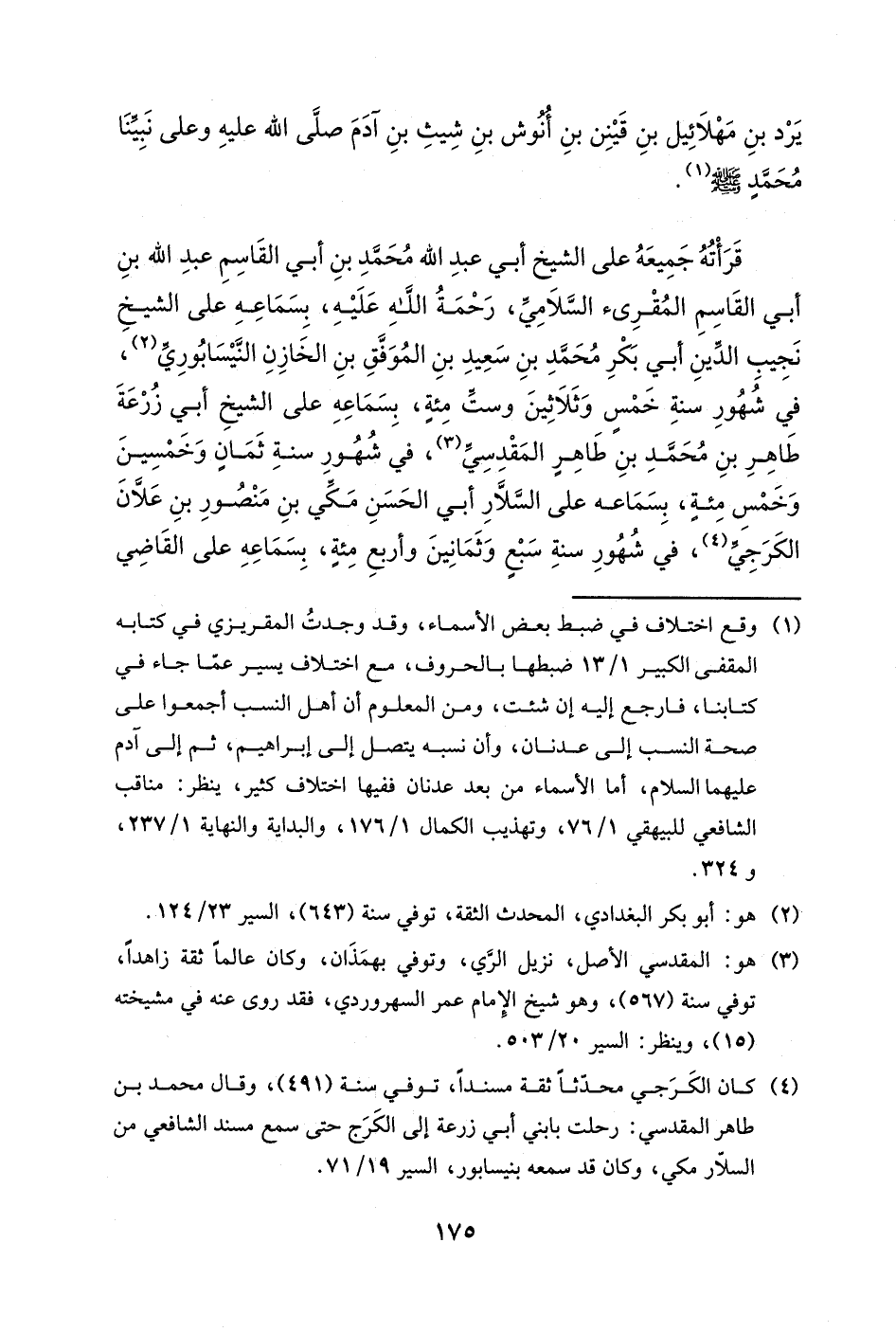 قرأته جميعه على الشيخ أبي عبد الله محمد بن أبي القاسم عبد الله بن أبي القاسم المقرئ السلامي، رحمة الله عليه، بسماعه على الشيخ نجيب الدين أبي بكر محمد بن سعيد بن الموفق بن الخازن النيسابوري، في شهور سنة خمسٍ وثلاثين وست مئةٍ، بسماعه على الشيخ أبي زرعة طاهر بن محمد بن طاهر المقدسي، في شهور سنة ثمانٍ وخمسين وخمس مئةٍ، بسماعه على السلار أبي الحسن مكي بن منصور بن علان الكرجي، في شهور سنة سبعٍ وثمانين وأربع مئةٍ، بسماعه على القاضي