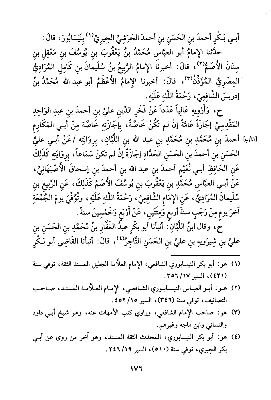 ح، وأرويه عالياً عدداً عن فخر الدين علي بن أحمد بن عبد الواحد المقدسي إجازةً عامةً إن لم تكن خاصةً، بإجازته خاصة من أبي المكارم أحمد بن محمد بن محمد بن عبد الله بن اللبان، بروايته عن أبي علي الحسن بن أحمد بن الحسن الحداد إجازةً إن لم تكن سماعاً، بروايته كذلك عن الحافظ أبي نعيم أحمد بن عبد الله بن أحمد بن إسحاق الأصبهاني، عن أبي العباس محمد بن يعقوب بن يوسف الأصم كذلك، عن الربيع بن سليمان المرادي، عن الإمام الشافعي، رحمة الله عليه، وتوفي يوم الجمعة آخر يومٍ من رجبٍ سنة أربع ومئتين، عن أربعٍ وخمسين سنةً.