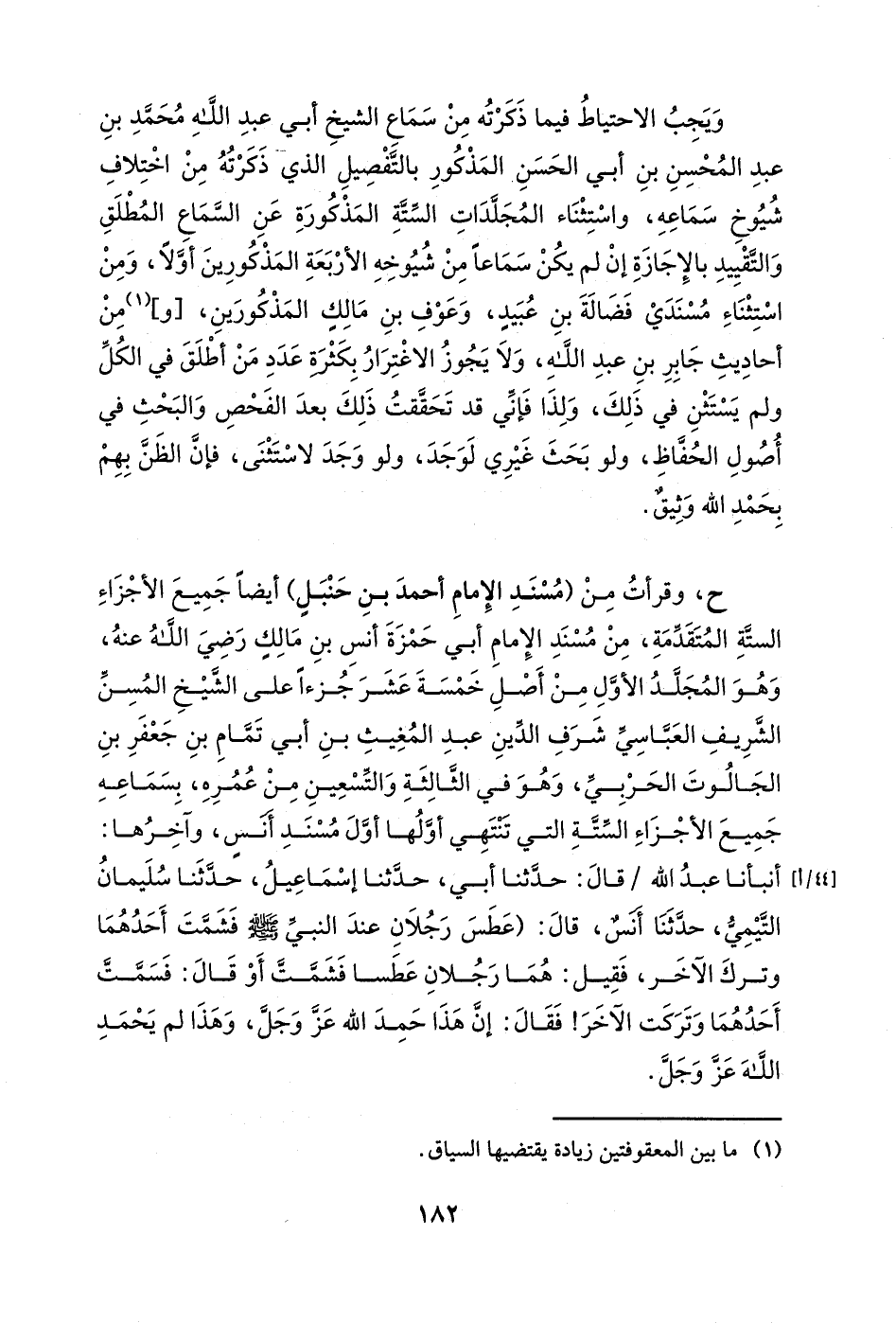 ويجب الاحتياط فيما ذكرته من سماع الشيخ أبي عبد الله محمد بن عبد المحسن بن أبي الحسن المذكور بالتفصيل الذي ذكرته من اختلاف شيوخ سماعه، واستثناء المجلدات الستة المذكورة عن السماع المطلق والتقييد بالإجازة إن لم يكن سماعاً من شيوخه الأربعة المذكورين أولاً، ومن استثناء مسندي فضالة بن عبيدٍ، وعوف بن مالك المذكورين، [و] من أحاديث جابر بن عبد الله، ولا يجوز الاغترار بكثرة عدد من أطلق في الكل ولم يستثن في ذلك، ولذا فإني قد تحققت ذلك بعد الفحص والبحث في أصول الحفاظ، ولو بحث غيري لوجد، ولو وجد لاستثنى، فإن الظن بهم بحمد الله وثيقٌ.
