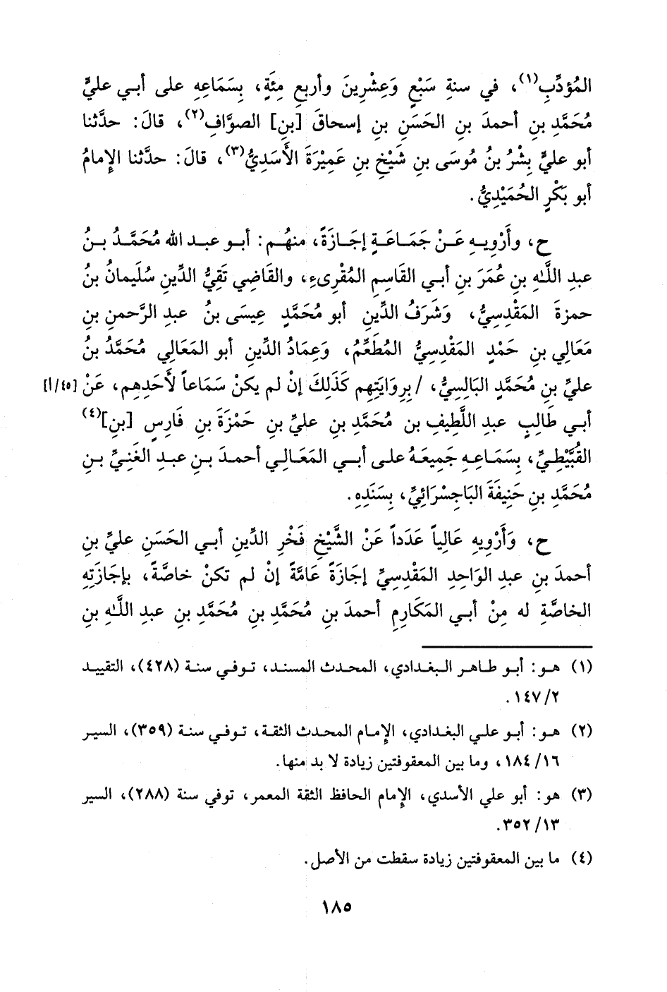 ح، وأرويه عالياً عدداً عن الشيخ فخر الدين أبي الحسن علي بن أحمد بن عبد الواحد المقدسي إجازةً عامةً إن لم تكن خاصةً، بإجازته الخاصة له من أبي المكارم أحمد بن محمد بن محمد بن عبد الله بن